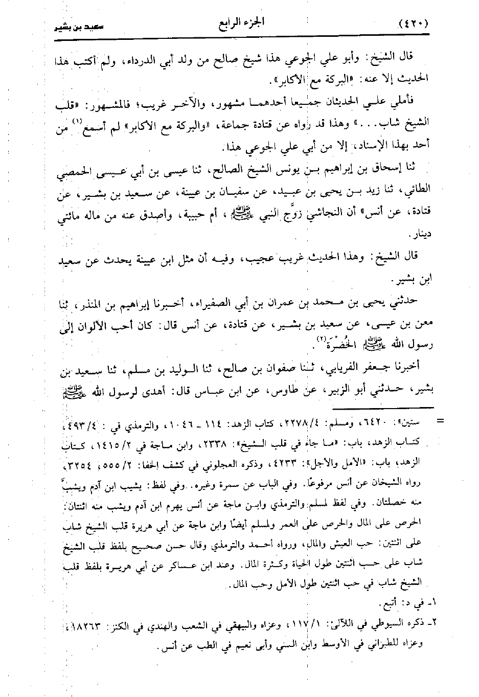 فأملى علي الحديثان جمعيا أحدهما مشهور والآخر غريب فالمشهور قلب الشَّيْخ شاب وهذا قد رَواه عَن قَتادَة جماعة والبركة مع الأكابر لم أسمع من أحد بهذا الإسناد إلاَّ من أبي علي الجوعي هَذَا.