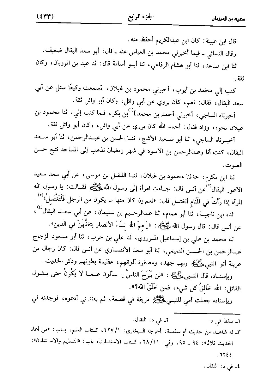 حَدَّثَنَا ابْنُ مُكْرَمٍ، حَدَّثَنا مَحْمُودُ بْنُ غيلان، حَدَّثَنا الْفَضْلُ بْنُ مُوسَى، عَن أَبِي سَعْدٍ سَعِيد الأَعْوَرِ الْبَقَّالِ، عَن أَنَس قَالَ جَاءَتِ امْرَأَةٌ إِلَى رَسُولِ اللَّهِ صَلَّى اللَّهُ عَلَيْهِ وَسَلَّمَ فَقَالَتْ يَا رَسُولَ اللهِ الْمَرْأَةُ إِذَا رَأَتْ فِي الْمَنَامِ أَتَغْتَسِلْ؟ قَال: نَعم إِذَا كَانَ مِنْهَا مَا يَكُونُ مِنَ الرَّجُلِ فلتغتسل.