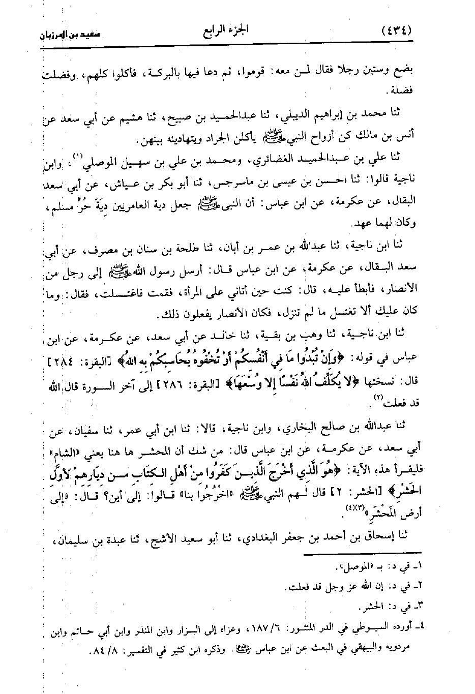 حَدَّثَنَا ابن ناجية، حَدَّثَنا وَهْبُ بْنُ بَقِيَّةَ، حَدَّثَنا خالد، عَن أبي سعد، عن عِكرمَة، عنِ ابْن عباس في قوله وَإِنْ تُبْدُوا مَا فِي أَنْفُسِكُمْ أَوْ تُخْفُوهُ يُحَاسِبْكُمْ بِهِ الله قَالَ نسختها لا يُكَلِّفُ اللَّهُ نفسا إلاَّ وسعها إلى آخر السورة قَالَ اللَّه قد فعلت.