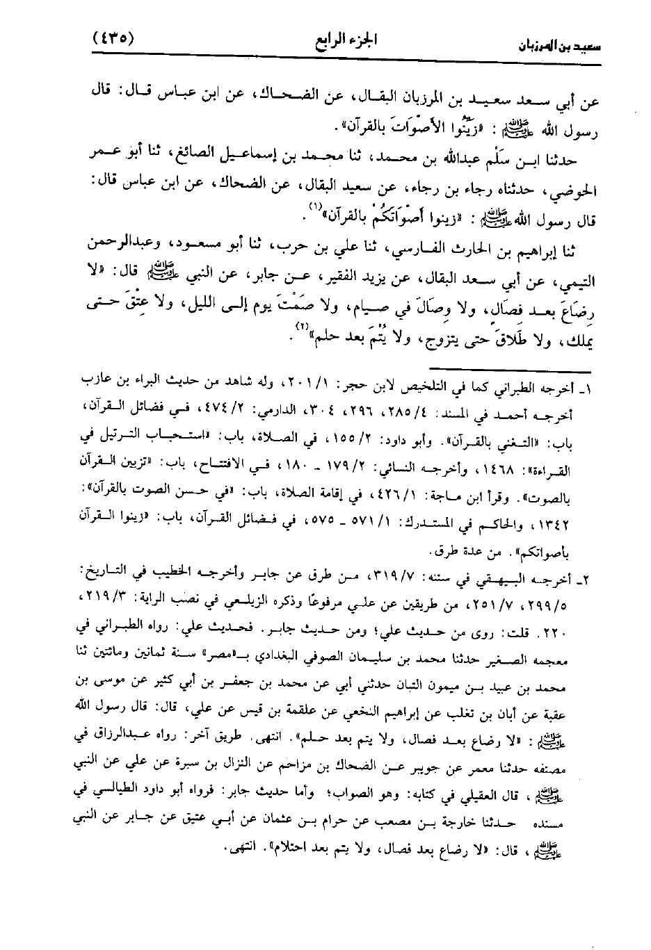 عَنْ أَبِي سَعْدٍ سَعِيد بْنِ الْمَرْزُبَانِ الْبَقَّالِ عَنِ الضَّحَّاكِ، عنِ ابْنِ عَبَّاسٍ، قَال: قَال رَسُولُ اللَّهِ صَلَّى اللَّهُ عَلَيْهِ وَسَلَّمَ زينوا الأصوات بالقرآن د.