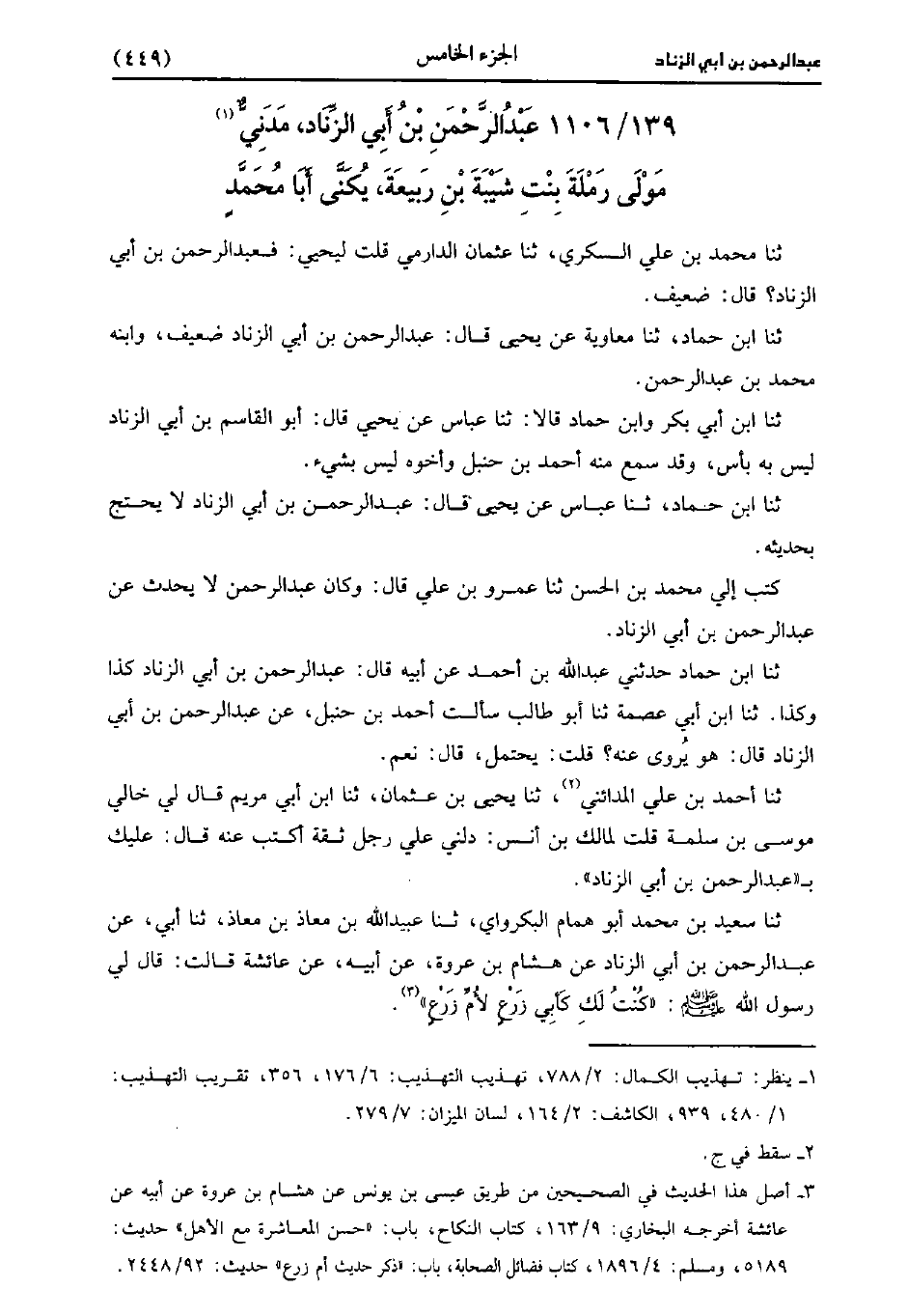 1106- عَبد الرَّحْمَنِ بْنُ أَبِي الزِّنَادِ مدني مولى رملة بنت شيبة بن ربيعة، يُكَنَّى أبا مُحَمد.
