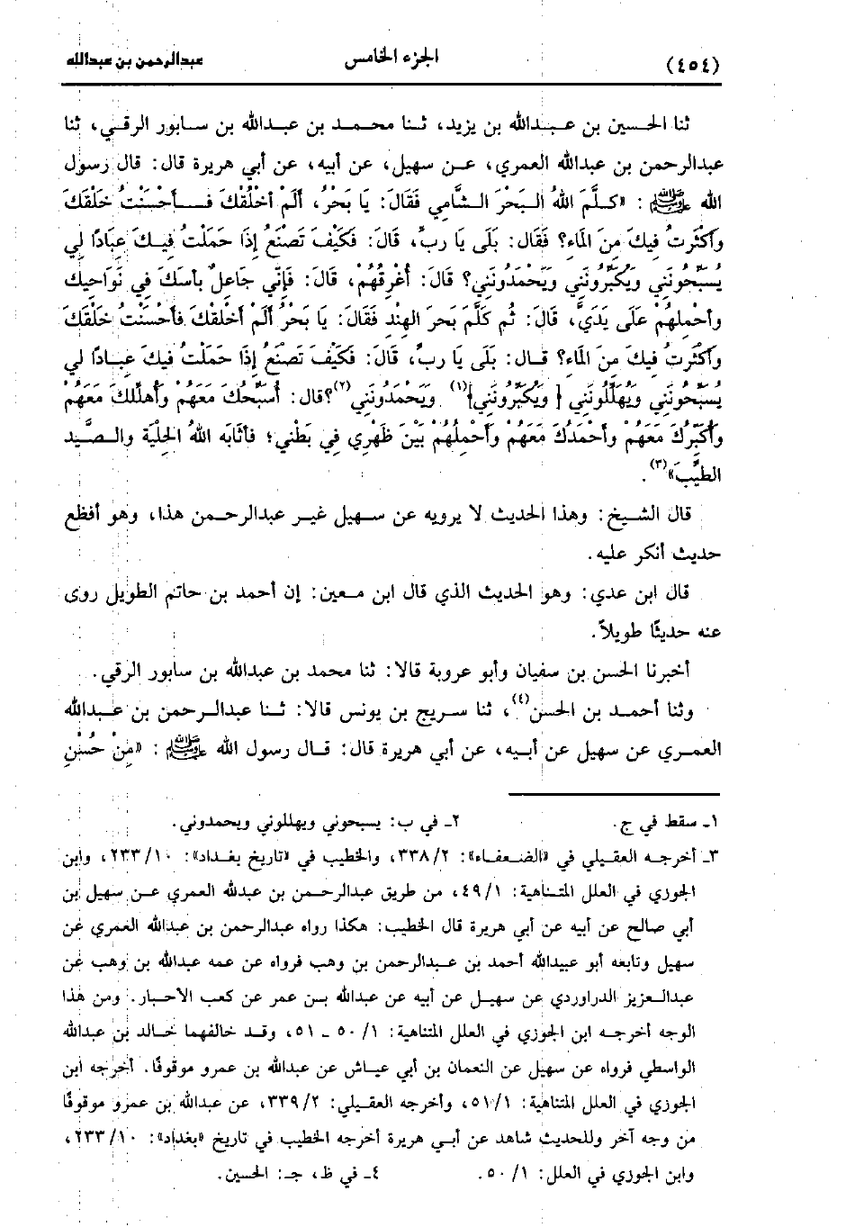 حَدَّثَنَا الْحُسَيْنُ بْنُ عَبد اللَّهِ بْنِ يَزِيدَ، حَدَّثَنا مُحَمد بْنُ عَبد اللَّهِ بْنِ سَابُورَ الرِّقِّيُّ، حَدَّثَنا عَبد الرَّحْمَنِ بْنُ عَبد اللَّهِ العُمَريّ عَنْ سُهَيْلٍ، عَنْ أَبِيهِ، عَن أَبِي هُرَيْرَةَ، قَال: قَال رَسُولُ اللَّهِ صَلَّى اللَّهُ عَلَيْهِ وَسَلَّمَ كَلَّمَ اللَّهُ الْبَحْرَ الشَّامِيَّ، فَقَالَ، يَا بَحْرُ أَلَمْ أَخْلُقْكَ فَأَحْسَنْتُ خَلْقَكَ وَأَكْثَرْتُ فِيكَ مِنَ الْمَاءِ فَقَالَ بَلَى يَا رَبِّ قَالَ فَكَيْفَ تَصْنَعُ إِذَا حَمَلْتُ فِيكَ عِبَادًا لِي يُسَبِّحُونِي وَيُكَبِّرُونِي وَيُحَمِّدُونِي قَالَ أُغْرِقُهُمْ قَالَ فَإِنِّي جَاعِلٌ بَأْسَكَ فِي نَوَاحِيكَ وَأَحْمِلْهُمْ عَلَى يَدَيَّ قَالَ ثُمَّ كَلَّمَ بَحْرَ الْهِنْدِ، فَقَالَ، يَا بَحْرُ أَلَمْ أَخْلُقْكَ فَأَحْسَنْتُ خَلْقَكَ وَأَكْثَرْتُ فِيكَ مِنَ الْمَاءِ قَالَ بَلَى يَا رَبِّ قَالَ فَكَيْفَ تَصْنَعُ إِذَا حَمَلْتُ فِيكَ عِبَادًا لي يسبحوني ويهللوني ويكبروني ويحمدوني قَالَ أُسَبِّحُكَ مَعَهُمْ وَأُهَلِّلُكَ مَعَهُمْ وَأُكَبِّرُكَ مَعَهُمْ وَأَحْمَدُكَ مَعَهُمْ وَأَحْمِلُهُمْ بَيْنَ ظَهْرِي فِي بِطْنِي فَأَثَابَهُ اللَّهُ الْحِلْيَةَ وَالصَّيْدَ الطَّيِّبَ.