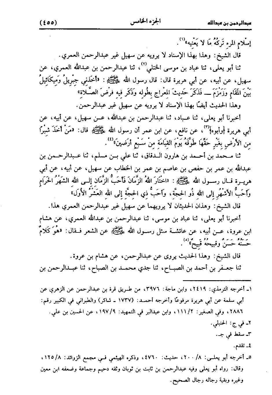 قال الشيخ: وهذان الحديثان لا يرويهما عن سهيل غير عَبد الرحمن العُمَريّ هذا.