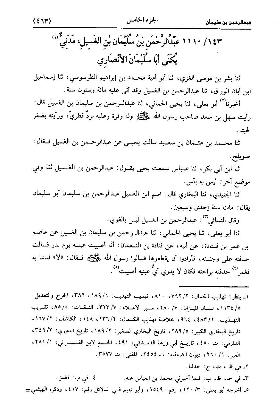 1110- عَبد الرَّحْمَنِ بْنُ سُلَيْمَانَ بْنِ الغسيل مدني، يُكَنَّى أبا سليمان الأنصاري.