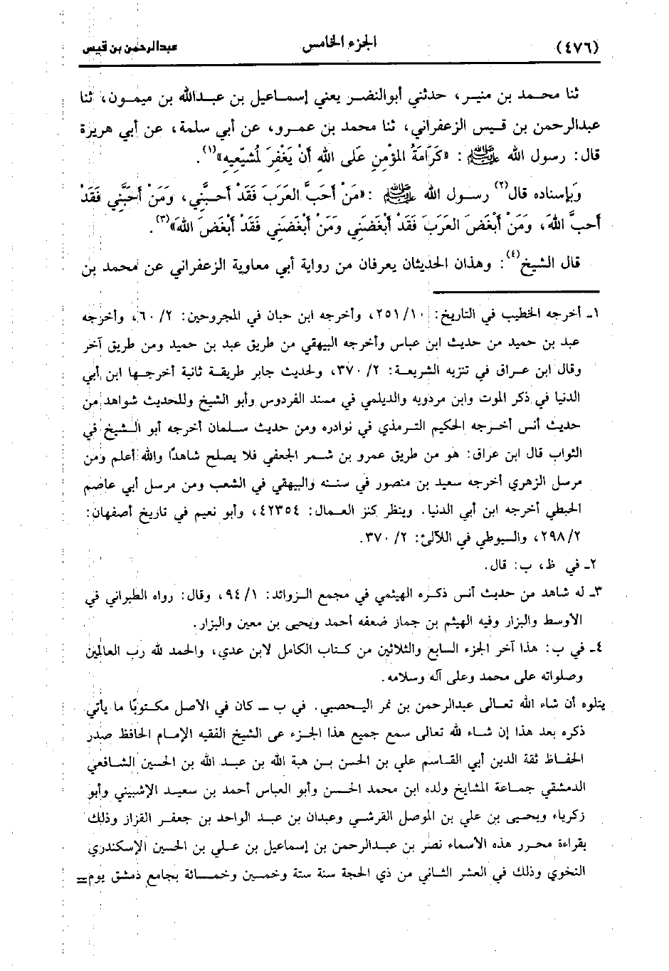 - وَبِإِسْنَادِهِ؛ قَال رَسُول اللهِ صَلَّى اللَّهُ عَلَيهِ وَسلَّمَ مَنْ أَحَبَّ الْعَرَبَ فَقَدْ أَحَبَّنِي، ومَنْ أَحَبَّنِي فَقَدْ أَحَبَّ اللَّهَ، ومَنْ أَبْغَضَ الْعَرَبَ فَقَدْ أَبْغَضَنِي، ومَنْ أَبْغَضَنِي فَقَدْ أَبْغَضَ اللَّهَ.