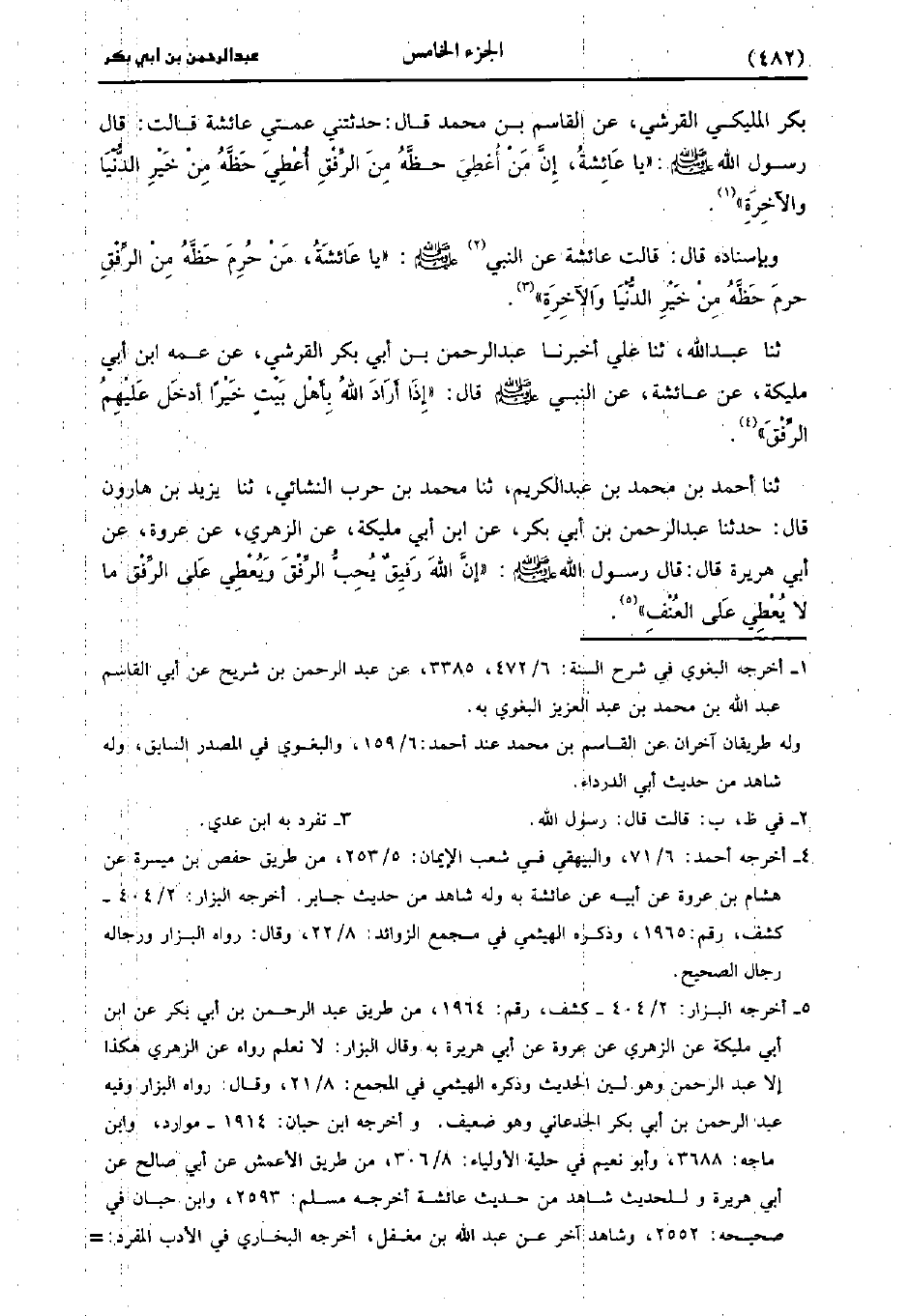 بَكْرٍ الْمُلَيْكِيُّ الْقُرَشِيُّ، عَنِ الْقَاسِمِ بْنِ مُحَمد قَالَ حَدَّثَتْنِي عَمَّتِي عَائِشَةَ قَالَتْ قَال رَسُول اللهِ صَلَّى اللَّهُ عَلَيهِ وَسلَّمَ يَا عَائِشَةُ إِنَّ مَنْ أُعْطِيَ حَظَّهُ مِنَ الرِّفْقِ أُعْطِيَ حَظَّهُ مِنْ خَيْرِ الدُّنْيَا وَالآخِرَةِ.