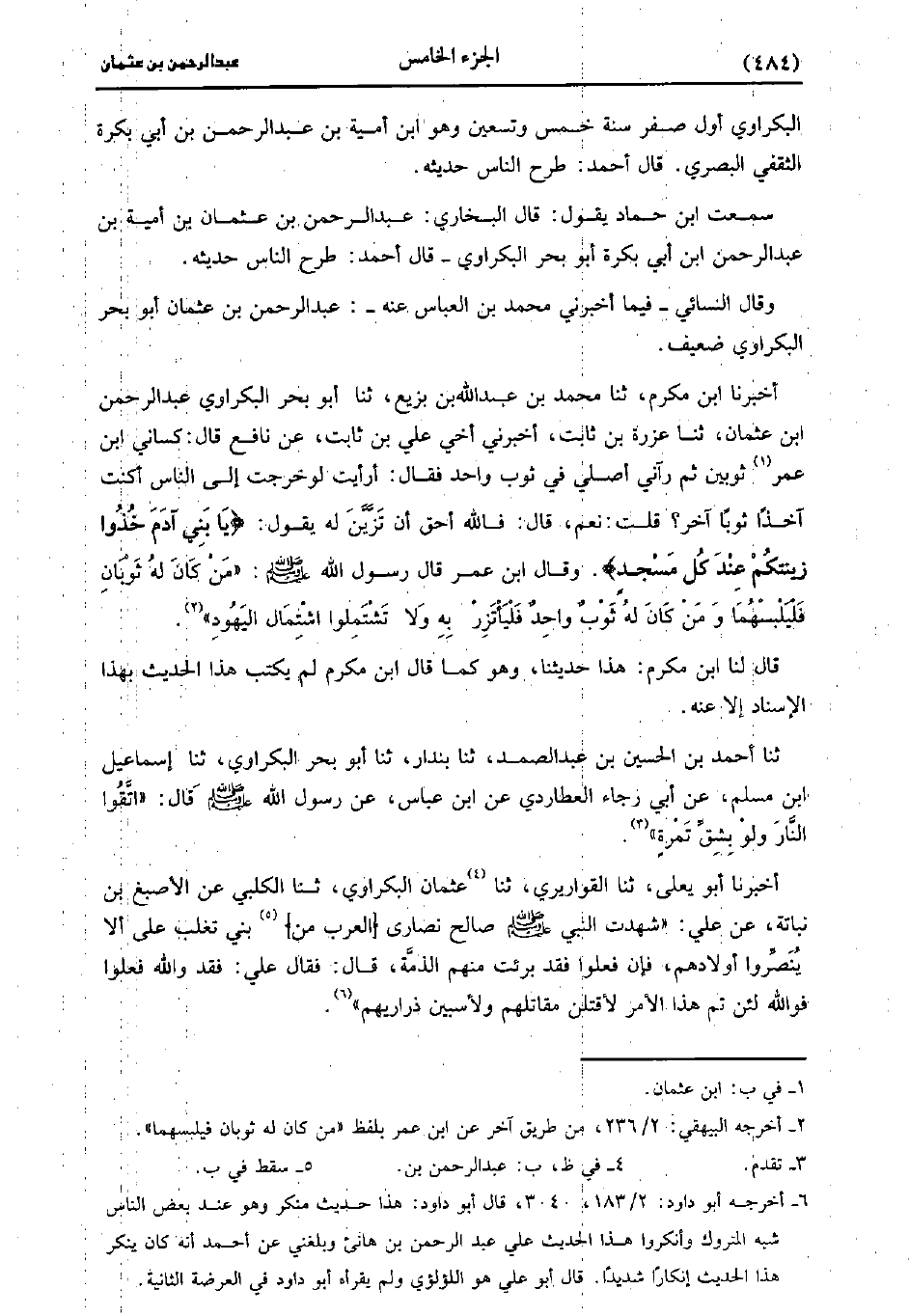 سمعتُ ابن حماد يقول: قال البُخارِيّ عَبد الرحمن بن عثمان بن أمية بن عَبد الرحمن بن أبي بكرة أبو بحر البكراوي قال أحمد طرح الناس حديثه.