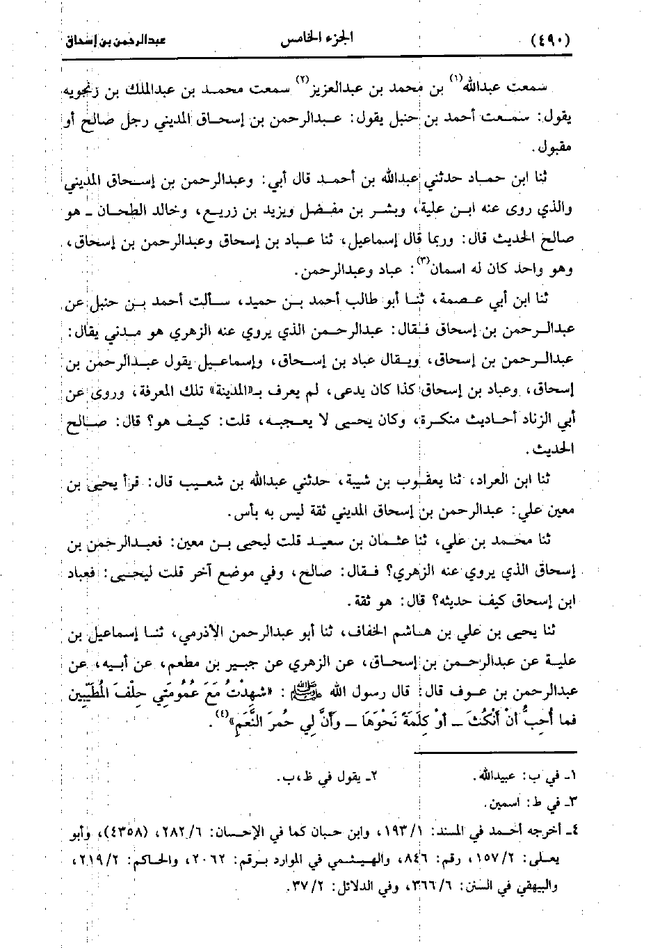سَمِعْتُ عَبد اللَّهِ بْنَ مُحَمد بن عَبد العزيز سمعت مُحَمد بْنُ عَبد الْمَلِكِ بْنِ زَنْجَوَيْهِ يَقُولُ: سَمعتُ أَحْمَدَ بْنَ حَنْبَلٍ يقول عَبد الرحمن بن إسحاق المديني رجل صالح أو مقبول.