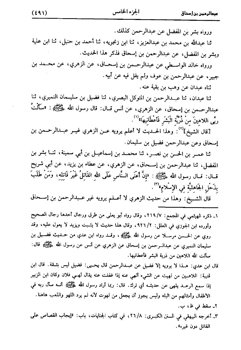 حَدَّثَنَا عُمَر بْنُ الْحَسَنِ بْنِ نصر، حَدَّثَنا مُحَمد بْنُ إِسْمَاعِيلَ بْنِ أبي سمينة، حَدَّثَنا بشر بن المفضل، حَدَّثَنا عَبد الرَّحْمَنِ بْنُ إِسْحَاقَ، عنِ الزُّهْريّ عَنْ عَطَاءِ بْنِ يَزِيدَ، عَن أَبِي شُرَيْحٍ، قَال: قَال رَسُولُ اللَّهِ صَلَّى اللَّهُ عَلَيْهِ وَسَلَّمَ: إِنَّ أَعْتَى النَّاسِ عَلَى اللَّهِ الْقَاتِلُ غَيْرَ قَاتِلِهِ، ومَنْ طَلَبَ بُذَحْلِ الْجَاهِلِيَّةِ فِي الإِسْلامِ.