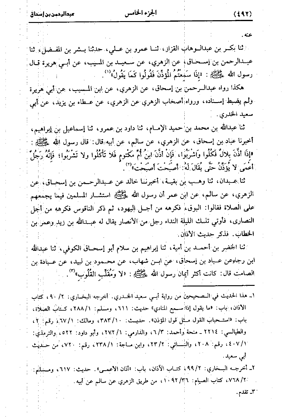 حَدَّثَنَا عَبد اللَّه بْنُ مُحَمد بن حميد الإمام، حَدَّثَنا داود بن عَمْرو، حَدَّثَنا إِسْمَاعِيلُ بْنُ إِبْرَاهِيمَ، أَخْبَرنا عَبَّادُ بْنُ إِسْحَاقَ، عنِ الزُّهْريّ عَنْ سَالِمٍ، عَنْ أَبِيهِ، قَال: قَال رَسُولِ اللَّهِ صَلَّى اللَّهُ عَلَيْهِ وَسَلَّمَ إِذَا أَذَّنَ بِلالٌ فَكُلُوا واشربوا فان أذن بن أُمِّ مَكْتُومٍ فَلا تَأْكُلُوا، ولاَ تَشْرَبُوا فَإِنَّهُ رَجُلٌ أَعْمَى لا يُؤَذِّنُ حَتَّى، يُقَال لَهُ: أَصْبَحْتَ أصبحت.