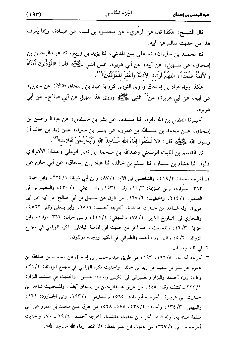حَدَّثَنَا مُحَمد بْنُ سُلَيْمَانَ، حَدَّثَنا علي بن المديني، حَدَّثَنا يَزِيدُ بْنُ زُرَيْعٍ، حَدَّثَنا عَبد الرَّحْمَنِ بْنِ إِسْحَاقَ عَنْ سُهَيْلٍ، عَنْ أَبِيهِ، عَن أَبِي هُرَيْرَةَ عَنِ النَّبِيِّ صَلَّى اللَّهُ عَلَيه وسَلَّم قَال: الْمُؤَذِّنُونَ أُمَنَاءُ وَالأَئِمَّةُ ضُمَنَاءُ اللَّهُمَّ أَرْشِدِ الأَئِمَّةَ وَاغْفِرْ لِلْمُؤَذِّنِيِنَ.