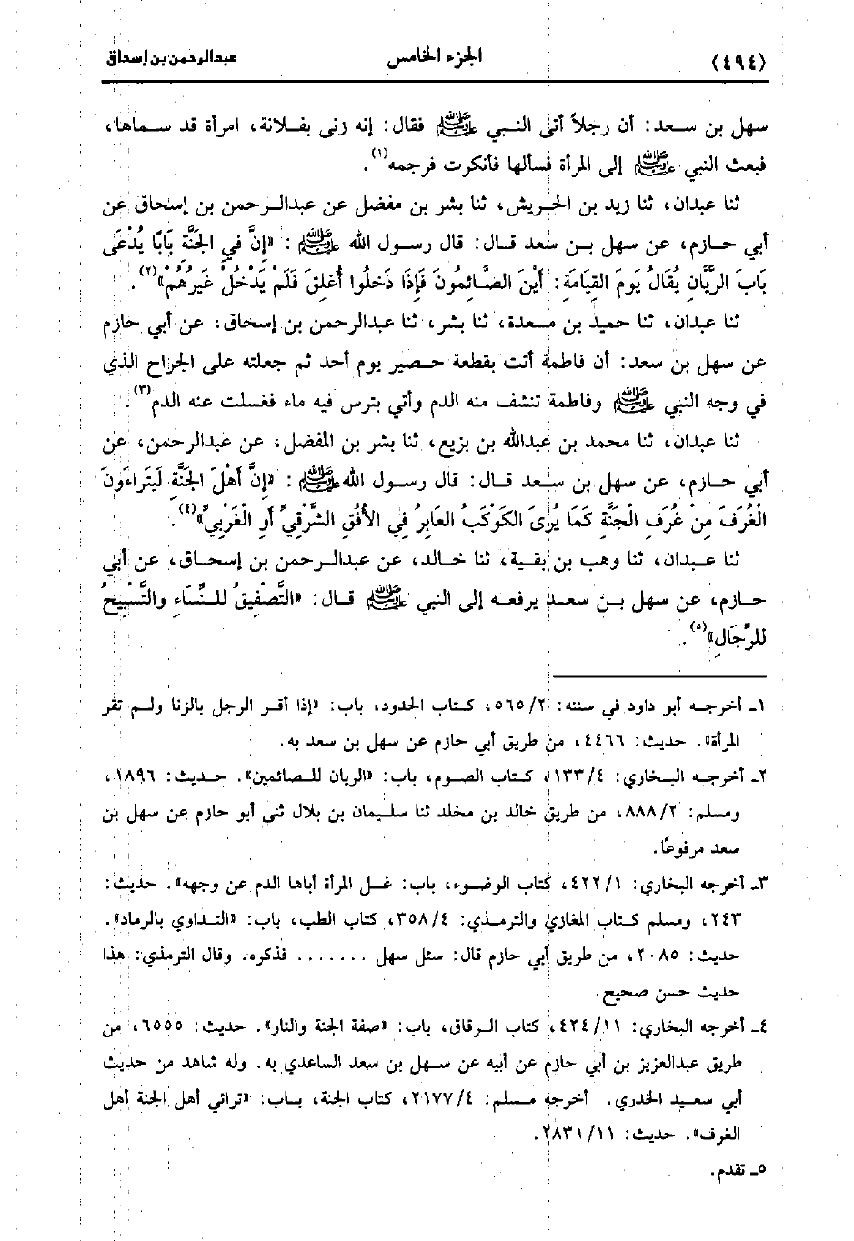 حَدَّثَنَا عَبْدَانُ، حَدَّثَنا زَيْدُ بْنُ الحريش، حَدَّثَنا بِشْرِ بْنِ مُفَضَّلٍ عَنْ عَبد الرَّحْمَنِ بْنِ إِسْحَاقَ، عَن أَبِي حَازِمٍ عَنْ سَهْلِ بْنِ سَعْدٍ، قَال: قَال رَسُولُ اللَّهِ صَلَّى اللَّهُ عَلَيْهِ وَسَلَّمَ: إِنَّ فِي الْجَنَّةِ بَابًا يُدْعَى بَابَ الرَّيَّانِ يُقَالُ يَوْمَ الْقِيَامَةِ أَيْنَ الصَّائِمُونَ فَإِذَا دَخَلُوا أُغْلِقَ فَلَمْ يَدْخُلْ غيرهم.