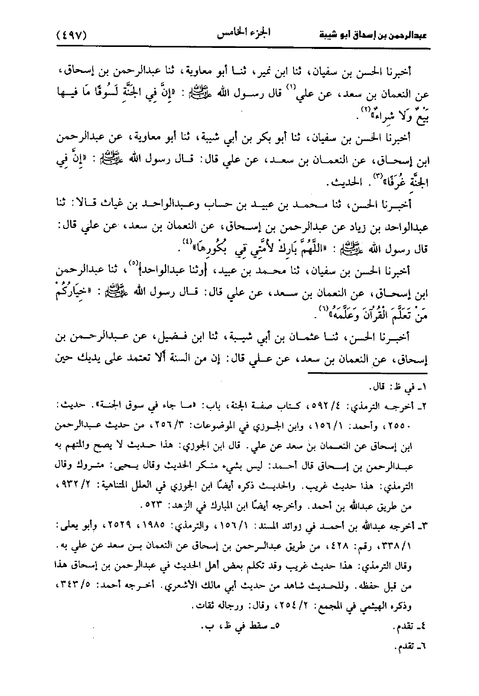 حَدَّثَنَا الْحَسَنُ بْنُ سُفْيَانَ، حَدَّثَنا أَبُو بَكْرِ بْنُ أَبِي شَيْبَةَ، حَدَّثَنا أَبُو مُعَاوِيَةَ عَنْ عَبد الرَّحْمَنِ بْنُ إِسْحَاقَ عَنِ النُّعْمَانِ بْنِ سَعْدٍ عَنْ عَلِيٍّ، قَال: قَال رَسُولِ اللَّهِ صَلَّى اللَّهُ عَلَيْهِ وَسَلَّمَ: إِنَّ فِي الْجَنَّةِ غُرَفًا الحديث.
