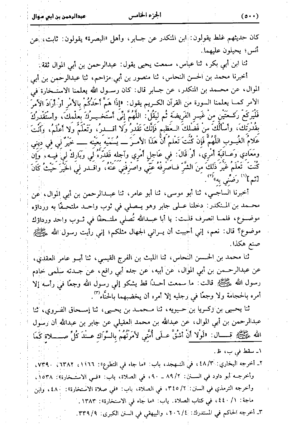 حَدَّثَنَا مُحَمد بْنُ الْحَسَنِ النحاس، حَدَّثَنا مَنْصُورُ بْنُ أَبِي مُزَاحِمٍ، حَدَّثَنا عَبد الرَّحْمَنِ بْنُ أَبِي الْمَوَالِي عَنْ مُحَمد بْنِ الْمُنْكَدِرِ عَنْ جَابِرٍ، قَال: كَانَ رَسُولُ اللَّهِ صَلَّى اللَّهُ عَلَيْهِ وَسَلَّمَ يُعَلِّمُنَا الاسْتِخَارَةَ فِي الأَمْرِ كَمَا يُعَلِّمُنَا السُّورَةَ مِنَ الْقُرْآنِ الْكَرِيمِ يَقُولُ إِذَا هَمَّ أَحَدُكُمْ بِالأَمْرِ أَوْ أَرَادَ الأَمْرَ فَلْيَرْكَعْ رَكْعَتَيْنِ مِنْ غَيْرِ الْفَرِيضَةِ ثُمَّ لِيَقُلْ اللَّهُمَّ إِنِّي أَسْتَخِيرُكَ بِعِلْمِكَ وَأَسْتَقْدِرُكَ بِقُدْرَتِكَ وَأَسْأَلُكَ مِنْ فَضْلِكَ الْعَظِيمِ فَإِنَّكَ تَقْدِرُ، ولاَ أَقْدِرُ وَتَعْلَمُ، ولاَ أَعْلَمُ وَأَنْتَ عَلامُ الْغُيُوبِ اللَّهُمَّ فَإِنْ كُنْتَ تَعْلَمُ أَنَّ هَذَا الأمر يسميه بعينه خيرا لِي فِي دِينِي وَمَعَادِي وَعَاقِبَةِ أَمْرِي أَوْ قَالَ فِي عَاجِلِ أَمْرِي وَآجِلِهِ فَقَدِّرْهُ لِي وَبَارِكْ لِي فِيهِ، وَإِنْ كُنْتَ تَعْلَمُ غَيْرَ ذَلِكَ مِنَ الشَّرِّ فَاصْرِفْهُ عَنِّي وَاصْرِفْنِي عَنْهُ وَاقْدِرْ لِيَ الخير حيث كان ثم ورضني به.