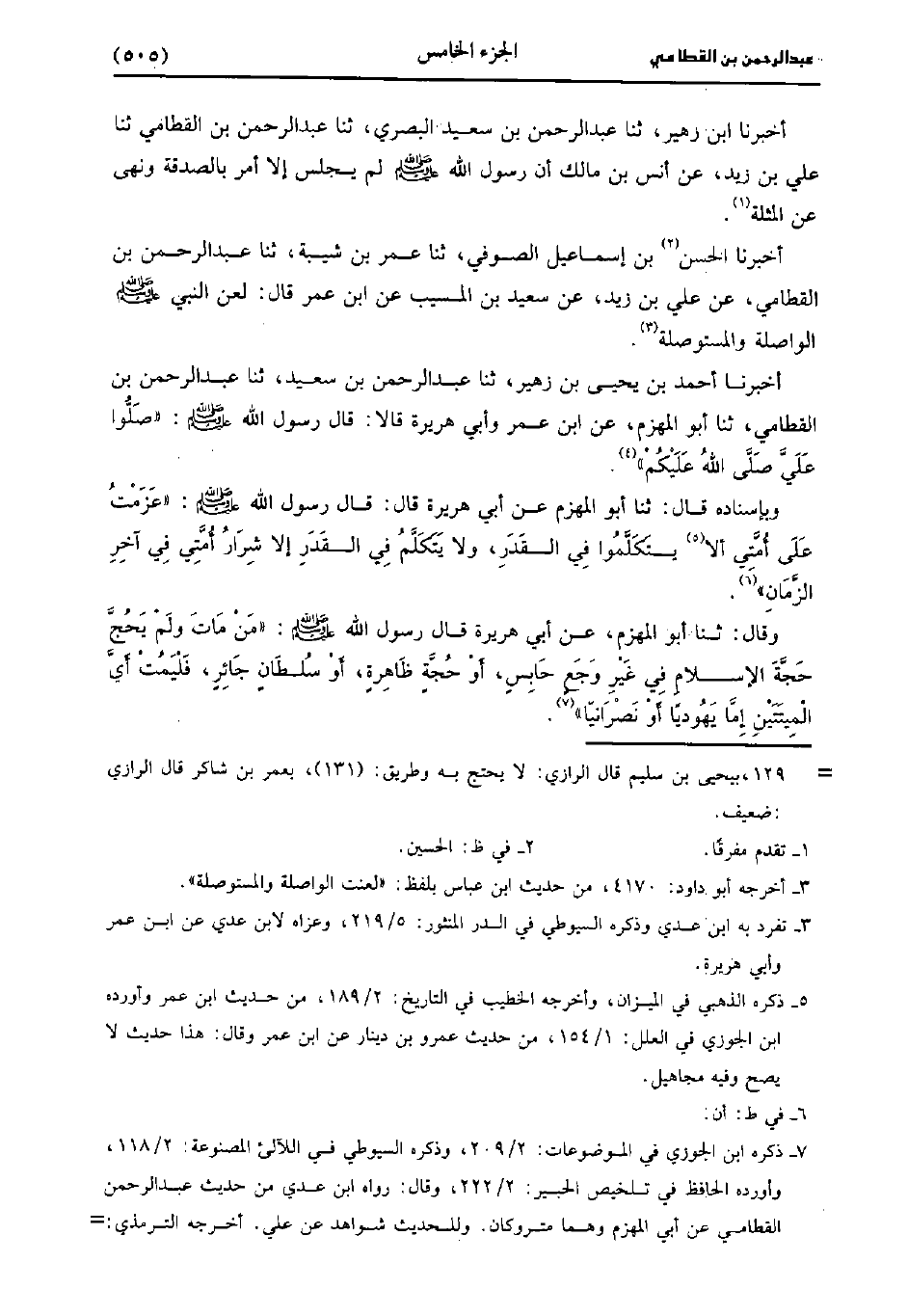 حَدَّثَنَا الحسن بن إسماعيل الصُّوفيّ، حَدَّثَنا عُمَر بن شيبة، حَدَّثَنا الْقُطَّامِيُّ بْنُ عَبد الرَّحْمِنِ عَنْ عَلِيُّ بْنُ زَيْدٍ عَنْ سَعِيد بْنِ المُسَيَّب، عنِ ابْنِ عُمَر قَالَ لَعَنَ النَّبِيُّ صَلَّى اللَّهُ عَلَيهِ وَسلَّمَ الواصلة والمستوصلة.