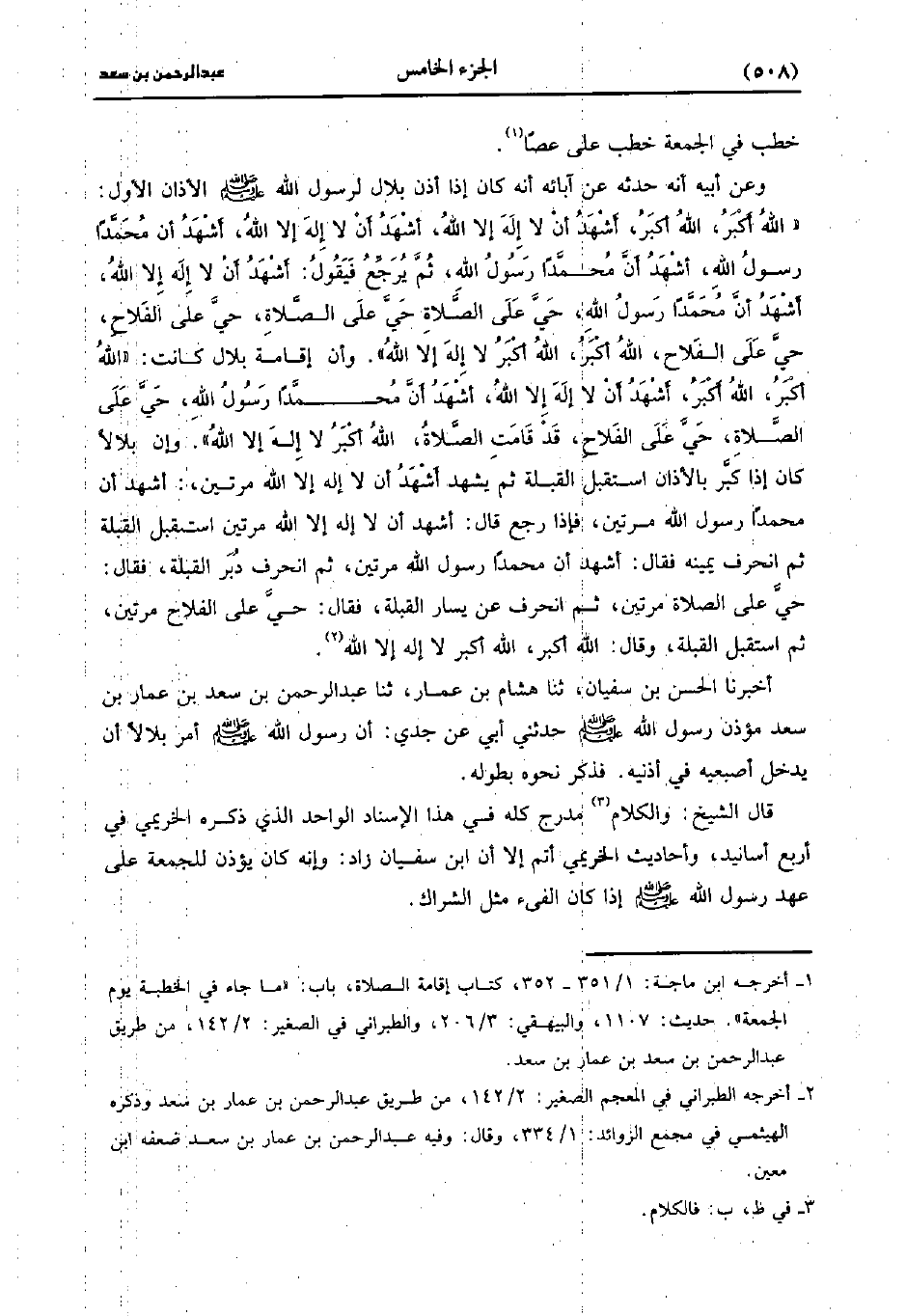 قال الشيخ: والكلام مدرج كله في هذا الإسناد الواحد الذي ذكره الخريمي في أربع أسانيد وأحاديث الخريمي أتم إلا أن بن سفيان زاد وإنه كان يؤذن للجمعة على عهد رسول اللَّهِ صَلَّى اللَّهُ عَلَيْهِ وَسَلَّمَ إذا كان الفيء مثل الشراك