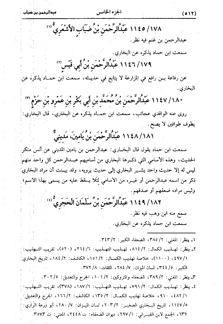 سمعتُ ابن حماد يقول: قال البُخارِيّ عَبد الرحمن بن يامين المديني، عَن أَنَس منكر الحديث وهذه الأسامي التي ذكرها البُخارِيّ من أساميهم عَبد الرحمن كل واحد منهم ليس له إلاَّ حديث واحد يشير البُخارِيّ إلى حديث يرويه وقد بينت أن مراد البُخارِيّ ذكر من اسمه عَبد الرحمن أو غيره من الأسامي لأن لا يسقط عليه من يسمى بهذا الاسم وليس مراده ضعفهم أو صدقهم.