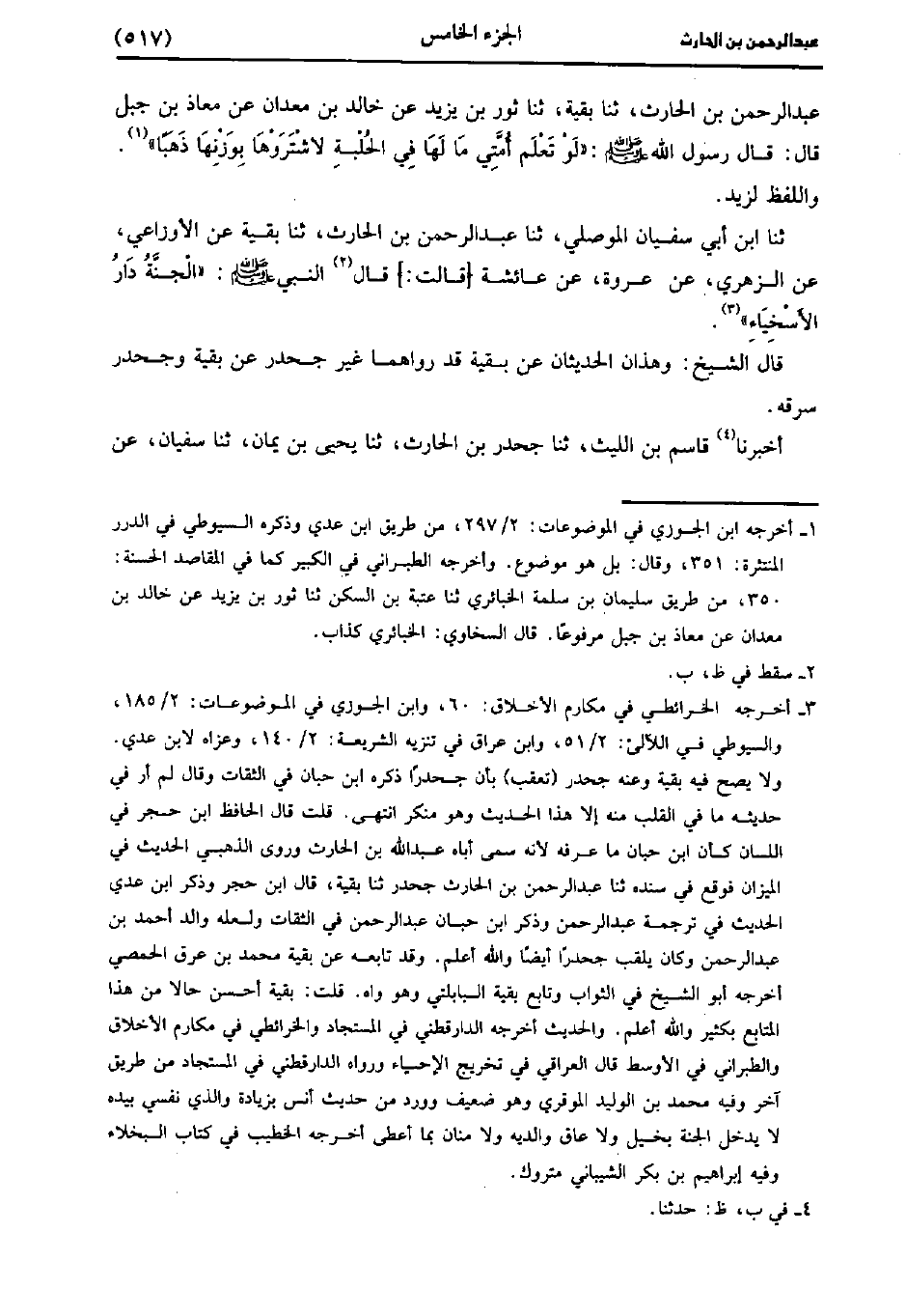 عَبد الرحمن بن الحارث، حَدَّثَنا بقية، حَدَّثَنا ثَوْرُ بْنُ يَزِيدَ عَنْ خَالِدِ بْنِ مَعْدَانَ عَنْ مُعَاذِ بْنِ جَبَلٍ، قَال: قَال رَسُولُ اللَّهِ صَلَّى اللَّهُ عَلَيْهِ وَسَلَّمَ لَوْ تَعْلَمُ أُمَّتِي مَا لَهَا فِي الْحُلْبَةِ لاشْتَرَوْهَا بِوَزْنِهَا ذَهَبًا واللفظ لزيد.