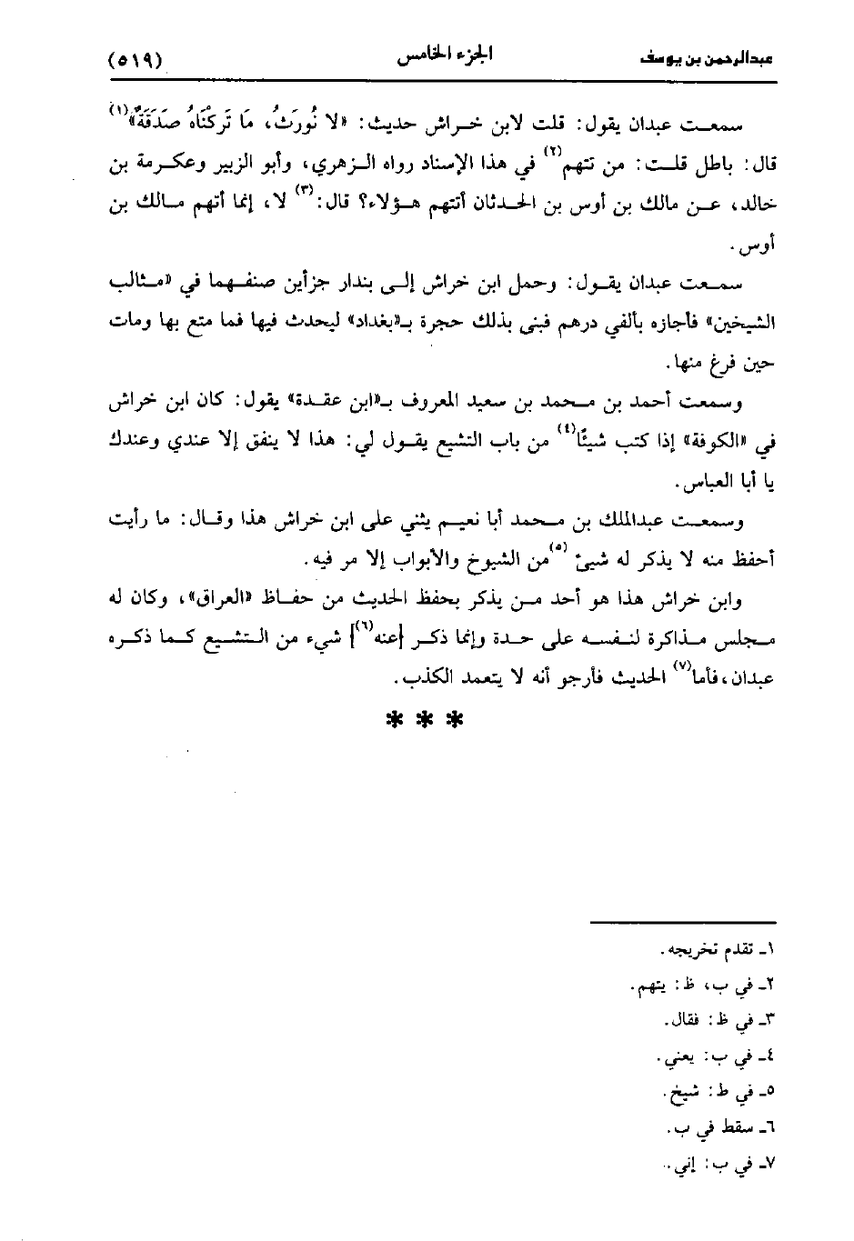 سَمِعْتُ عَبْدَانَ يَقُولُ قُلْتُ لابْنِ خِرَاشٍ حَدِيثُ لا نُورَثُ مَا تَرَكْنَاهُ صَدَقَةٌ قال باطل قلت من تتهم في هذا الإسناد رواه الزُّهْريّ، وأَبُو الزبير وعكرمة بن خالد عن مالك بن أوس بن الحدثان أتتهم هؤلاء؟ قَال: لاَ إنما أتهم مالك بن أوس.