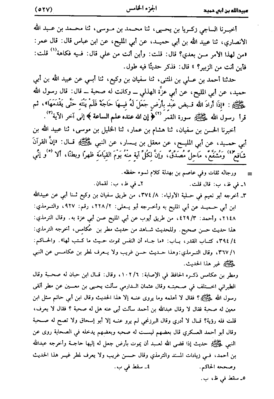 حَدَّثَنَا أَحْمَدُ بْنُ عَلِيِّ بْنِ الْمُثَنَّى، حَدَّثَنا سُفْيَانُ بْنُ وَكِيعٍ، حَدَّثَنا أَبِي عَنْ عُبَيد اللَّهِ بْنِ أَبِي حُمَيْدٍ، عَن أَبِي الْمُلَيْحِ، عَن أَبِي عَزَّةَ الْهُذَلِيِّ وَكَانَتْ لَهُ صُحْبَةٌ، قَال: قَال رَسُولُ اللَّهِ صَلَّى اللَّهُ عَلَيْهِ وَسَلَّمَ إِذَا أَرَادَ اللَّهُ قَبْضَ عَبد بِأَرْضٍ جَعَلَ لَهُ فِيهَا حَاجَةً فَلَمْ يَنْتَهِ حَتَّى يَقْدَمَهَا ثُمَّ قَرَأَ رَسُولِ اللَّهِ صَلَّى اللَّهُ عَلَيْهِ وَسَلَّمَ سُورَةَ الْقَمَرِ إِنَّ اللَّهَ عنده علم الساعة إلى آخر الآية.