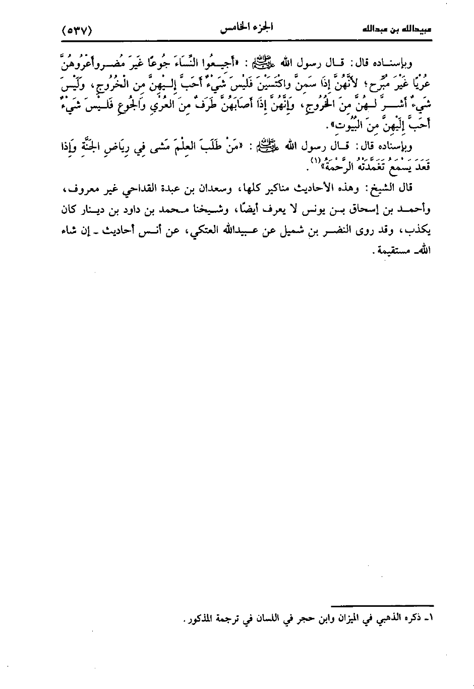 قال الشيخ: وهذه الأحاديث مناكير كلها وسعدان بن عبدة القداحي غير معروف وأحمد بن إسحاق بن يُونُس لا يعرف أَيضًا وشيخنا مُحَمد بن داود بن دينار كان يكذب وقد روى النضر بن شميل عن عُبَيد الله العتكي، عَن أَنَس أحاديث إن شاء الله مستقيمة