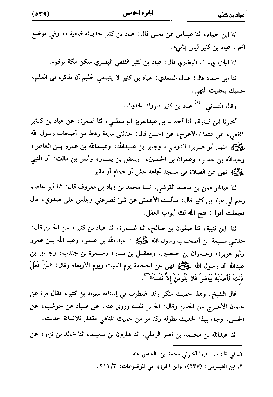 حَدَّثَنَا ابن حماد، قَال: قَال السعدي عباد بن كثير لا ينبغي لحليم أن يذكره في العلم حسبك بحديث النهي.