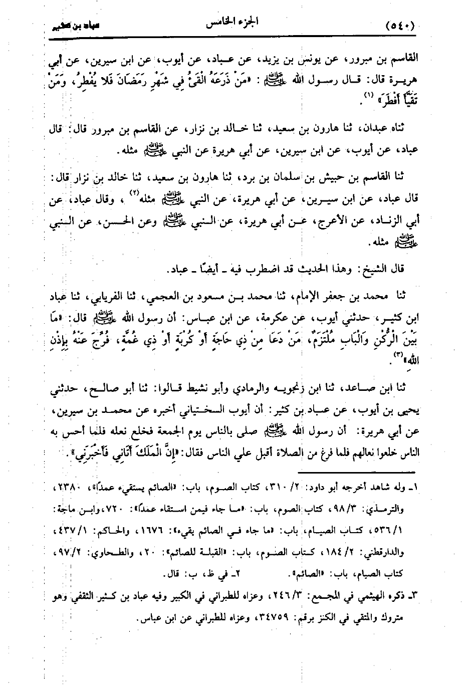 حَدَّثَنَا القاسم بن حبيش بن سليمان بن برد، حَدَّثَنا هارون بن سَعِيد، حَدَّثَنا خالد بن نزار، قَال: قَال عباد، عنِ ابن سِيرِين، عَن أَبِي هُرَيْرَةَ عَنِ النَّبِيِّ صَلَّى اللَّهُ عَلَيهِ وَسلَّمَ مِثْلَهُ وَقَالَ عباد، عَن أبي الزناد عن الأَعْرَجِ، عَن أَبِي هُرَيْرَةَ عَنِ النَّبِيُّ صَلَّى اللَّهُ عَلَيهِ وَسلَّمَ وعن الحسن، عَن النبي صَلَّى اللَّهُ عَلَيهِ وَسلَّمَ مِثْلَهُ.