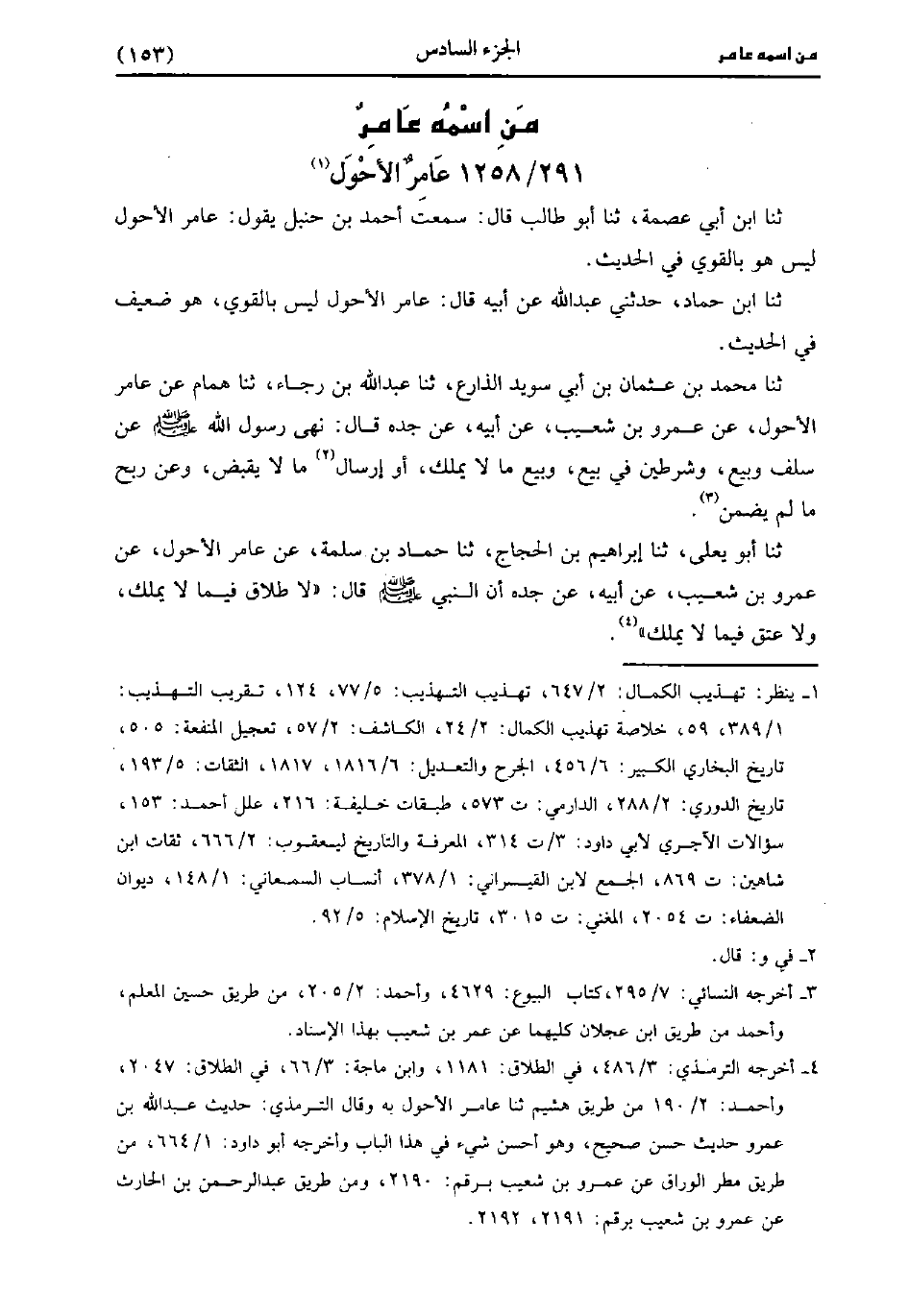 حَدَّثَنَا مُحَمد بْنُ عثمان بن أبي سُوَيْد الذِّارِع، حَدَّثَنا عَبد اللَّهِ بْنُ رَجَاءٍ، حَدَّثَنا هَمَّامٌ عَنْ عَامِرٍ الأَحْوَلِ عَنْ عَمْرو بْنِ شُعَيب، عَنْ أَبِيهِ، عَن جَدِّهِ قَالَ نَهَى رَسُولُ اللَّهِ صَلَّى اللَّهُ عَلَيْهِ وَسَلَّمَ عَنْ سَلَفٍ وَبَيْعٍ وَشَرْطَيْنِ فِي بَيْعٍ وَبَيْعِ مَا لا يَمْلِكُ أَوْ إِرْسَالِ مَا لا يَقْبِضُ وَعَنْ رِبْحِ مَا لَمْ يُضْمَنْ.