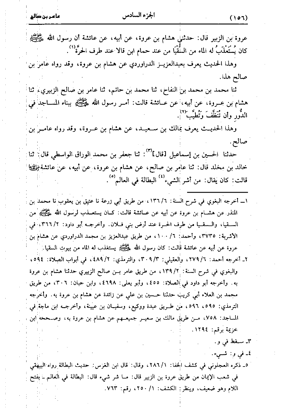 حَدَّثَنَا الْحُسَيْنُ بن إسماعيل، قَال: حَدَّثَنا جَعْفَرُ بْنُ مُحَمد الْوَرَّاقُ الْوَاسِطِيُّ، قَال: حَدَّثَنا خالد بن مخلد، قَال: حَدَّثَنا عَامِرُ بْنُ صَالِحٍ، عَنْ هِشَامِ بْنِ عُرْوَةَ، عَنْ أَبِيهِ عَنْ عائشة رضي الله عَنْهَا قَالَتْ كَانَ يُقَالُ مِنْ أَشَرِّ الشَّيْءِ الْبَطَالَةُ فِي الْعَالَمِ