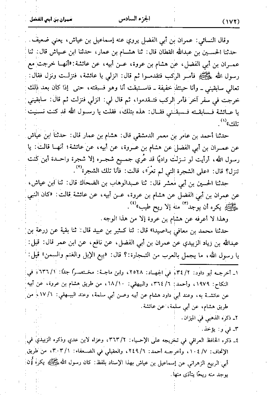 حَدَّثَنَا الْحُسَيْنُ بْنُ عَبد الله القطان، قَال: حَدَّثَنا هِشَامُ بْنُ عَمَّارٍ، حَدَّثَنا ابن عياش، قَال: حَدَّثَنا عِمْرَانُ بْنُ أَبِي الْفَضْلِ عَنْ هِشَامِ بْنِ عُرْوَةَ، عَنْ أَبِيهِ عَنْ عَائِشَةَ أَنَّهَا خَرَجَتْ مَعَ رَسُولِ اللَّهِ صَلَّى اللَّهُ عَلَيْهِ وَسَلَّمَ فَأَمَرَ الرَّكْبَ فَتَقَدَّمُوا ثُمَّ قَالَ انْزِلِي يَا عَائِشَةُ فَنَزَلْتُ ونزل فقال تعالي سابقني وَأَنَا حِينَئِذٍ خَفِيفَةٌ فَاسْتَبَقْتُ أَنَا، وَهو فَسَبَقْتُهُ حَتَّى إِذَا كَانَ بَعْدَ ذَلِكَ خَرَجْتُ فِي سَفَرٍ آخَرَ فَأَمَرَ الرَّكْبَ فَتَقَدَّمُوا ثُمَّ قَال لِي انْزِلِي فَنَزَلْتُ ثُمَّ قَالَ سَابِقِينِي يَا عَائِشَةُ فَسَابَقْتُهُ فَسَبَقَنِي فَقَالَ هَذِهِ بِتِلْكَ فَقُلْتُ يَا رَسُولَ اللهِ قَدْ كُنْتُ نَسِيتُ تِلْكَ.