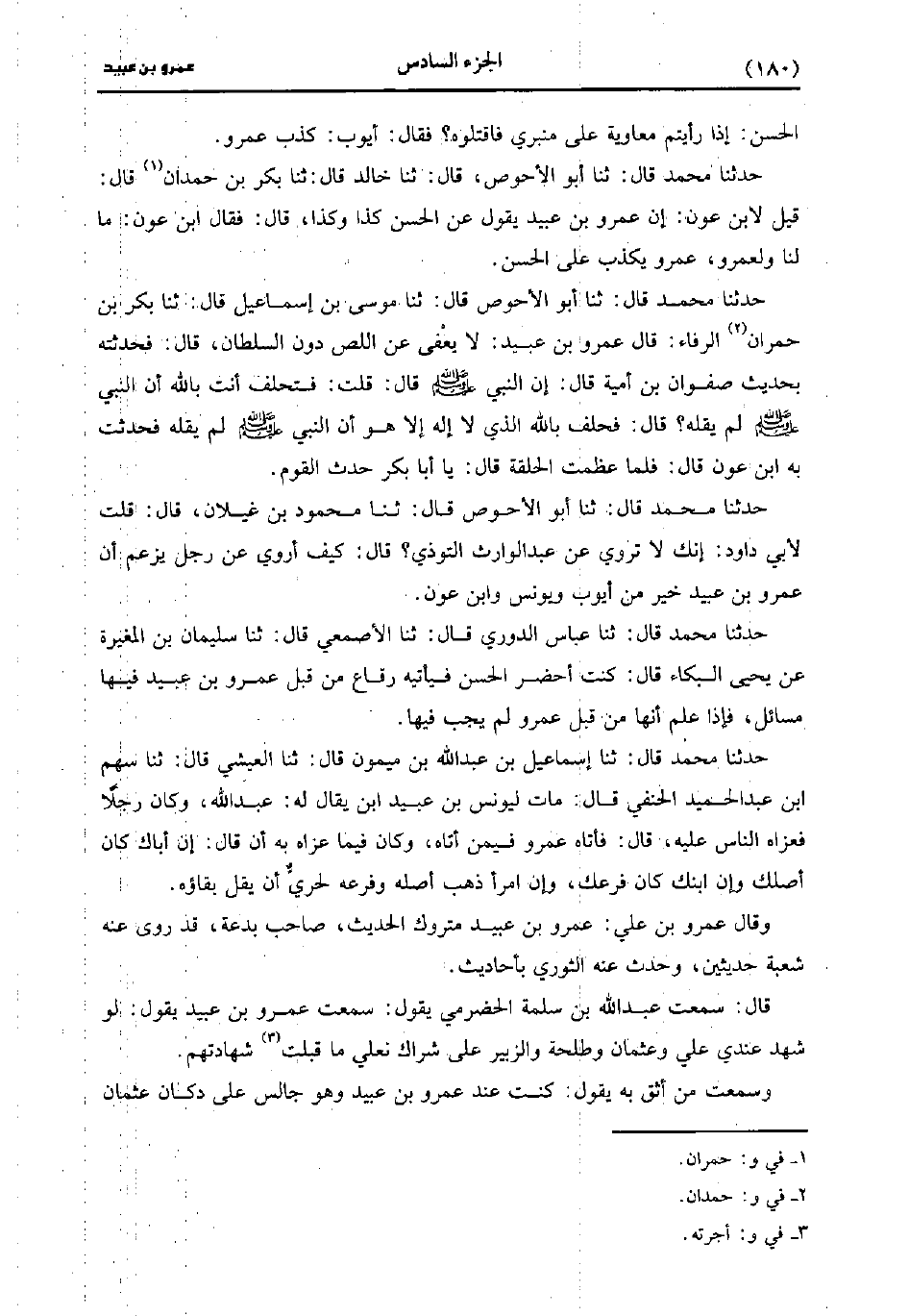 حَدَّثَنَا مُحَمد، قَال: حَدَّثَنا أَبُو الأحوص، قَال: حَدَّثَنا خالد، قَال: حَدَّثَنا بكر بْن حمران، قَال: قِيل لابن عون إن عَمْرو بْن عُبَيد يَقُولُ عَن الْحَسَن كذا وكذا، قَال: فَقال ابْن عون ما لنا ولعمرو عَمْرو يكذب عَلَى الْحَسَن.