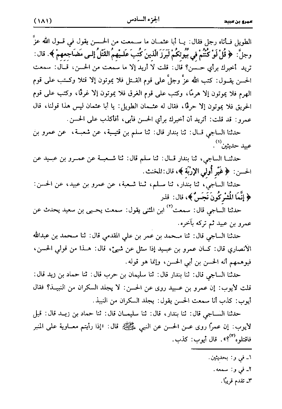 - حَدَّثَنَا الساجي، قَالَ: سَمِعْتُ ابْنَ الْمُثَنَّى يَقُولُ: سَمعتُ يَحْيى بن سَعِيد يحدث عن عَمْرو بْن عُبَيد ثُمَّ تركه بآخره.