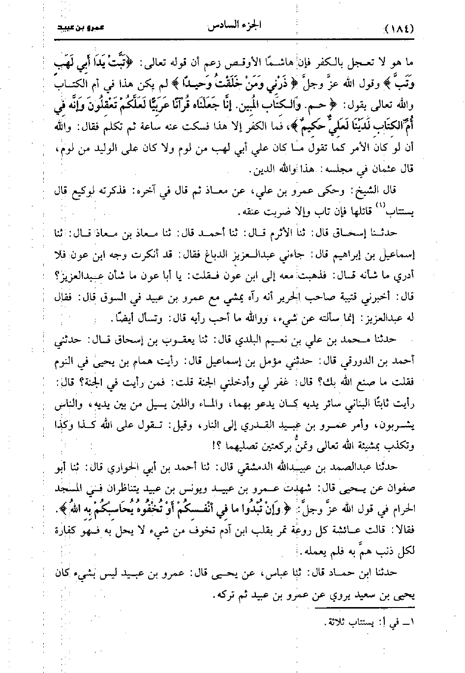 حَدَّثَنَا عَبد الصَّمَدِ بْنُ عُبَيد اللَّهِ الدِّمَشْقِيُّ، قَال: حَدَّثَنا أَحْمَدُ بْنُ أَبِي الْحَوَارِيِّ، قَال: حَدَّثَنا أَبُو صَفْوَانَ، عَن يَحْيى، قَالَ: شَهِدْتُ عَمْرو بْنَ عُبَيد وَيُونُسَ بْنَ عُبَيد يَتَنَاظَرَانِ فِي الْمَسْجِدِ الْحَرَامِ فِي قَوْلِ اللَّهِ عَزَّ وَجَلَّ، وَإِنْ تُبْدُوا مَا فِي أَنْفُسِكُمْ أَوْ تُخْفُوهُ يُحَاسِبْكُمْ بِهِ اللَّهُ فَقَالا قَالَتْ عَائِشَةُ كُلُّ روعة تمر بقلب بن آدَمَ تُخَوِّفُ مِنْ شَيْءٍ لا يَحِلُّ بِهِ فَهُوَ كَفَّارَةٌ لِكُلِّ ذَنْبٍ هَمَّ بِهِ فَلَمْ يَعْمَلْهُ.
