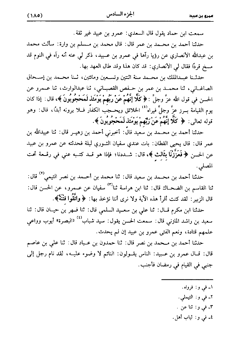 حَدَّثَنَا ابن مكرم، قَال: حَدَّثَنا عَلِيُّ بْنُ سَعِيد السُّلَمِيُّ، قَال: حَدَّثَنا فهر بن حيان، قَال: حَدَّثَنا سَعِيد بْنُ رَاشِدٍ الْمَازِنِيُّ، قَالَ: سَمِعْتُ الْحَسَنَ يَقُولُ سَيِّدُ شَبَابِ الْبَصْرَةِ أَيُّوبُ وَوَاعِي عِلْمِهِمْ قَتَادَةُ وَنِعْمَ الْفَتَى عَمْرو بْنُ عُبَيد إِنْ لَمْ يُحَدِّثْ.