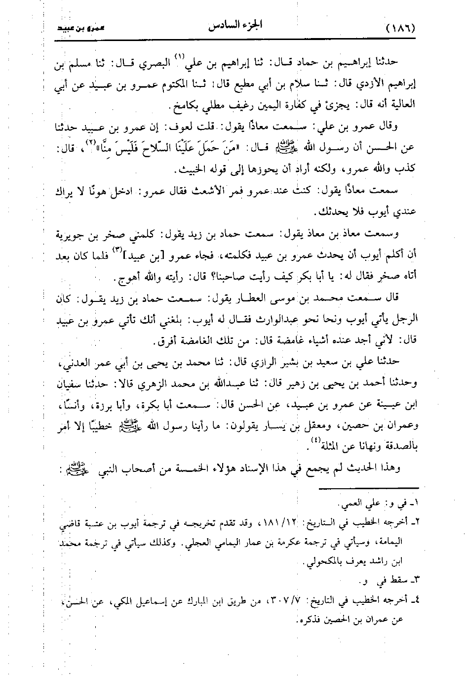 وسمعت معاذ بْن معاذ يقول: سَمعتُ حَمَّادَ بْنَ زَيْدٍ يَقُولُ كلمني صخر بْن جويرية أن أكلم أيوب أن يحدث عَمْرو بْن عُبَيد فكلمته فجاء عَمْرو بْن عُبَيد فلما كَانَ بعد أتاه صخر فَقَالَ لَهُ يا أبا بكر كيف رأيت صاحبنا قَالَ رأيته والله أهوج.