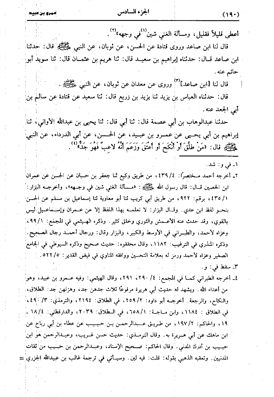 حَدَّثَنَا عَبد الْوَهَّابِ بْنُ أَبِي عِصْمَةَ، قَال: حَدَّثَنا أبي، قَال: حَدَّثَنا يَحْيى بْنُ عَبد اللَّهِ الأَوَانِيُّ، حَدَّثَنا إِبْرَاهِيمُ بْنُ أَبِي يَحْيى عَنْ عَمْرو بْنِ عُبَيد عَنِ الْحَسَنِ، عَن أَبِي الدَرْدَاءِ عَنِ النَّبِيِّ صَلَّى اللَّهُ عَلَيه وسَلَّم قَال: مَنْ طَلَّقَ أَوْ أَنْكَحَ أَوْ أَعْتَقَ وَزَعَمَ أَنَّهُ لاعب فهو جد