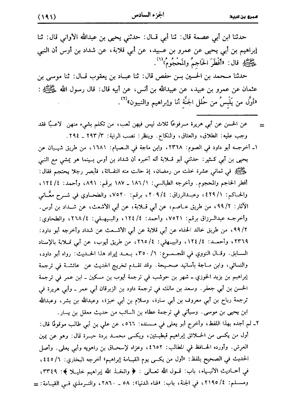 ، حَدَّثَنا ابْن أَبِي عِصْمَة، قَال: حَدَّثَنا أَبِي، قَال: حَدَّثني يَحْيى بْنُ عَبد الله الأواني، قَال: حَدَّثَنا إِبْرَاهِيمُ بْنُ أَبِي يَحْيى عَنْ عَمْرو بْنِ عُبَيد، عَن أَبِي قِلابَةَ عَنْ شَدَّادِ بْنِ أَوْسٍ أَنّ النَّبِيَّ صَلَّى اللَّهُ عَلَيه وسَلَّم قَال: أَفْطَرَ الْحَاجِمُ وَالْمَحْجُومُ.