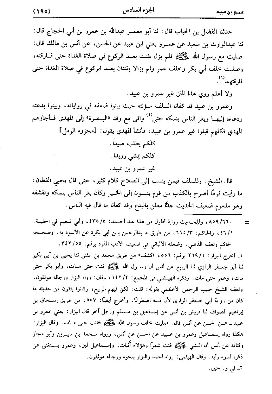 وَعَمْرُو بْنُ عُبَيد قَدْ كَفَانَا السَّلَفُ مؤونته حَيْثُ بَيَّنُوا ضَعْفَهُ فِي رِوَايَاتِهِ وَبَيَّنُوا بِدْعَتَهُ وَدُعَاءَهُ إِلَيْهَا وَيَغُرُّ النَّاسَ بِنُسُكِهِ حَتَّى وَافَى مَعَ وَفْدِ الْبَصْرَةِ إِلَى الْمَهْدِيِّ فَأَجَازَهُمُ الْمَهْدِيُّ فَكُلُّهُمْ قَبِلُوا غَيْرُ عَمْرو بْنِ عُبَيد فَأَنْشَأَ الْمَهْدِيُّ يَقُولُ.