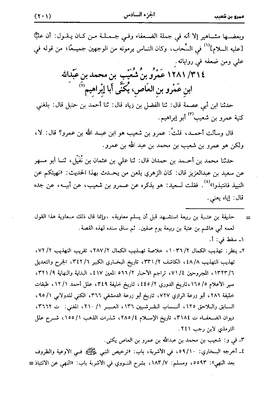 1281- عَمْرو بْن شُعَيب بْنُ مُحَمد بْنِ عَبد اللَّهِ بْن عَمْرو بْن العاص، يُكَنَّى أبا إِبْرَاهِيم.