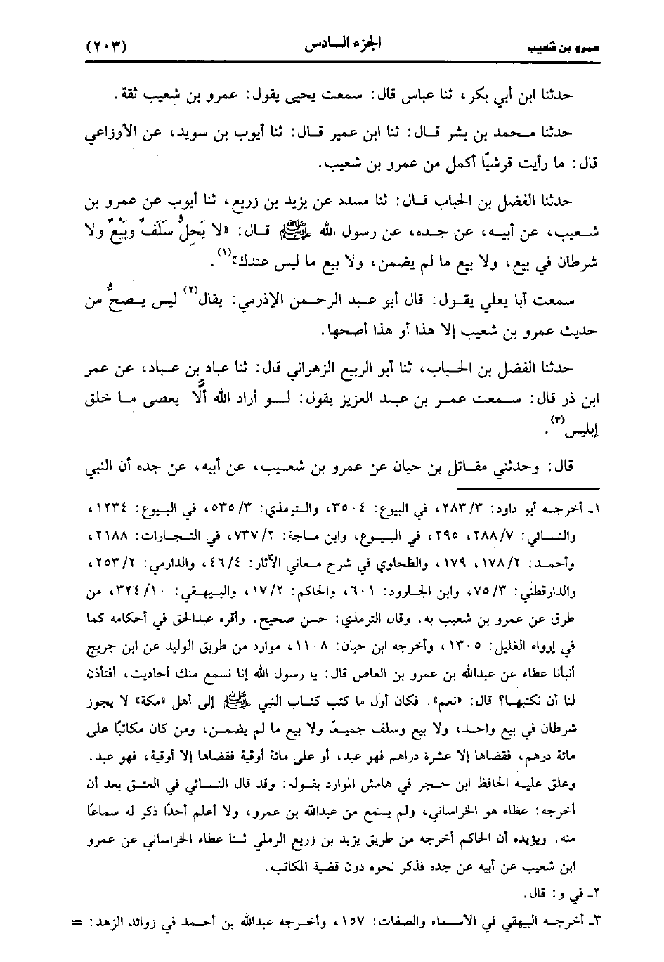 حَدَّثَنَا الْفَضْلُ بْنُ الْحُبَابِ، قَال: حَدَّثَنا مُسَدَّد عَنْ يَزِيدَ بْنِ زُرَيْعٍ، حَدَّثَنا أَيُّوبَ، عَن عَمْرو بْنِ شُعَيب، عَنْ أَبِيهِ، عَن جَدِّهِ عَنْ رَسُولِ اللَّهِ صَلَّى اللَّهُ عَلَيْهِ وَسَلَّمَ صَلَّى اللَّهُ عَلَيه وسَلَّم قَال: لا يَحِلُّ سَلَفٌ وَبَيْعٌ، ولاَ شَرْطَانِ فِي بَيْعٍ، ولاَ بَيْعُ مَا لَمْ يُضْمَنْ، ولاَ بَيْعُ مَا لَيْسَ عِنْدَكَ.