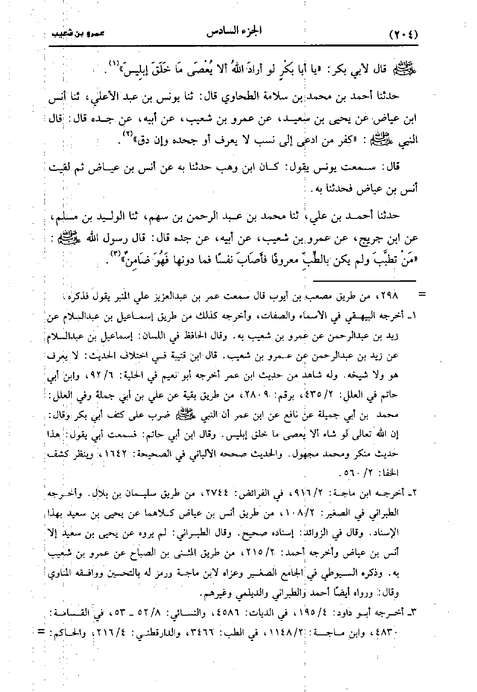 حَدَّثَنَا أَحْمَدُ بْنُ مُحَمد بْنِ سَلامَةَ الطحاوي، قَال: حَدَّثَنا يُونُس بْنُ عَبد الأَعْلَى، حَدَّثَنا أَنَسُ بْنُ عِيَاضٍ، عَن يَحْيى بْنِ سَعِيد عَنْ عَمْرو بْنِ شُعَيب، عَنْ أَبِيهِ، عَن جَدِّهِ، قَال: قَال النَّبِيُّ صَلَّى اللَّهُ عَلَيهِ وَسلَّمَ كَفَرَ مَنِ ادَّعَى إِلَى نَسَبٍ لا يُعْرَفُ أَوْ جَحَدَهُ وَإِنْ دَقَّ.