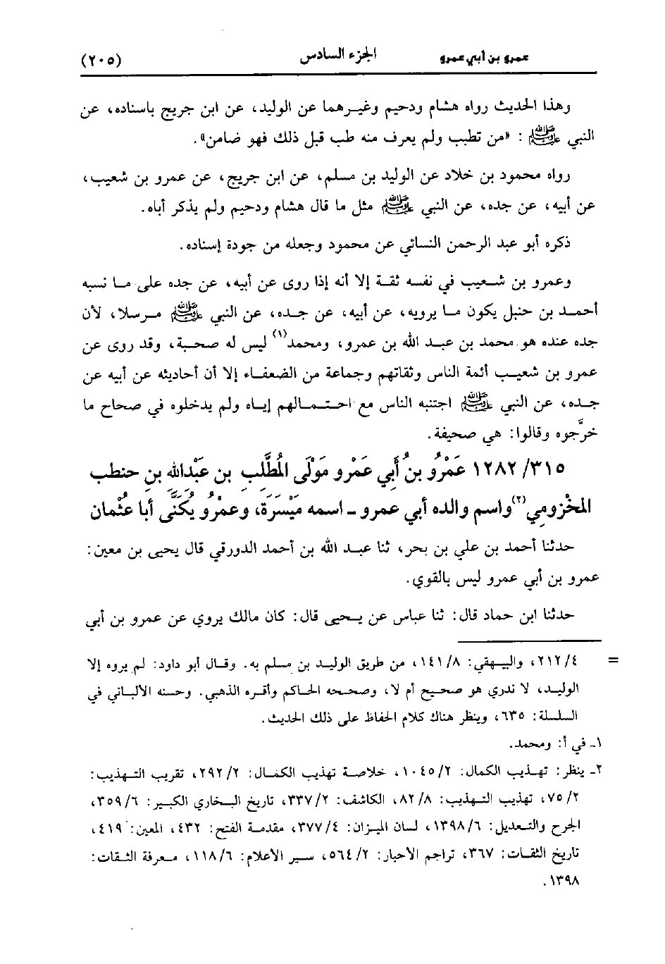وَعَمْرُو بْنُ شُعَيب فِي نَفْسِهِ ثِقَةٌ إلاَّ أَنَّهُ إِذَا رَوَى عَنْ أَبِيهِ، عَن جَدِّهِ عَلَى مَا نَسَبَهُ أَحْمَدُ بْنُ حَنْبَلٍ يَكُونُ مَا يَرْوِيهِ، عَنْ أَبِيهِ، عَن جَدِّهِ عَنْ النَّبِيُّ صَلَّى اللَّهُ عَلَيهِ وَسلَّمَ مُرْسَلا لأَنَّ جَدَّهُ عِنْدَهُ هُوَ مُحَمد بْنُ عَبد اللَّهِ بْنِ عَمْرو مُحَمد لَيْسَ لَهُ صُحْبَةٌ وَقَدْ رَوَى عَنْ عَمْرو بْنِ شُعَيب أَئِمَّةُ النَّاسِ وَثِقَاتُهُمْ وَجَمَاعَةٌ مِنَ الضُّعَفَاءِ إلاَّ أَنَّ أَحَادِيثُهُ، عَنْ أَبِيهِ، عَن جَدِّهِ عَنْ النَّبِيُّ صَلَّى اللَّهُ عَلَيهِ وَسلَّمَ اجْتَنَبَهُ النَّاسُ مَعَ احْتِمَالِهِمْ إِيَّاهُ وَلَمْ يُدْخِلُوهُ فِي صِحَاحِ مَا خَرَّجُوهُ وَقَالُوا هِيَ صَحِيفَةٌ.