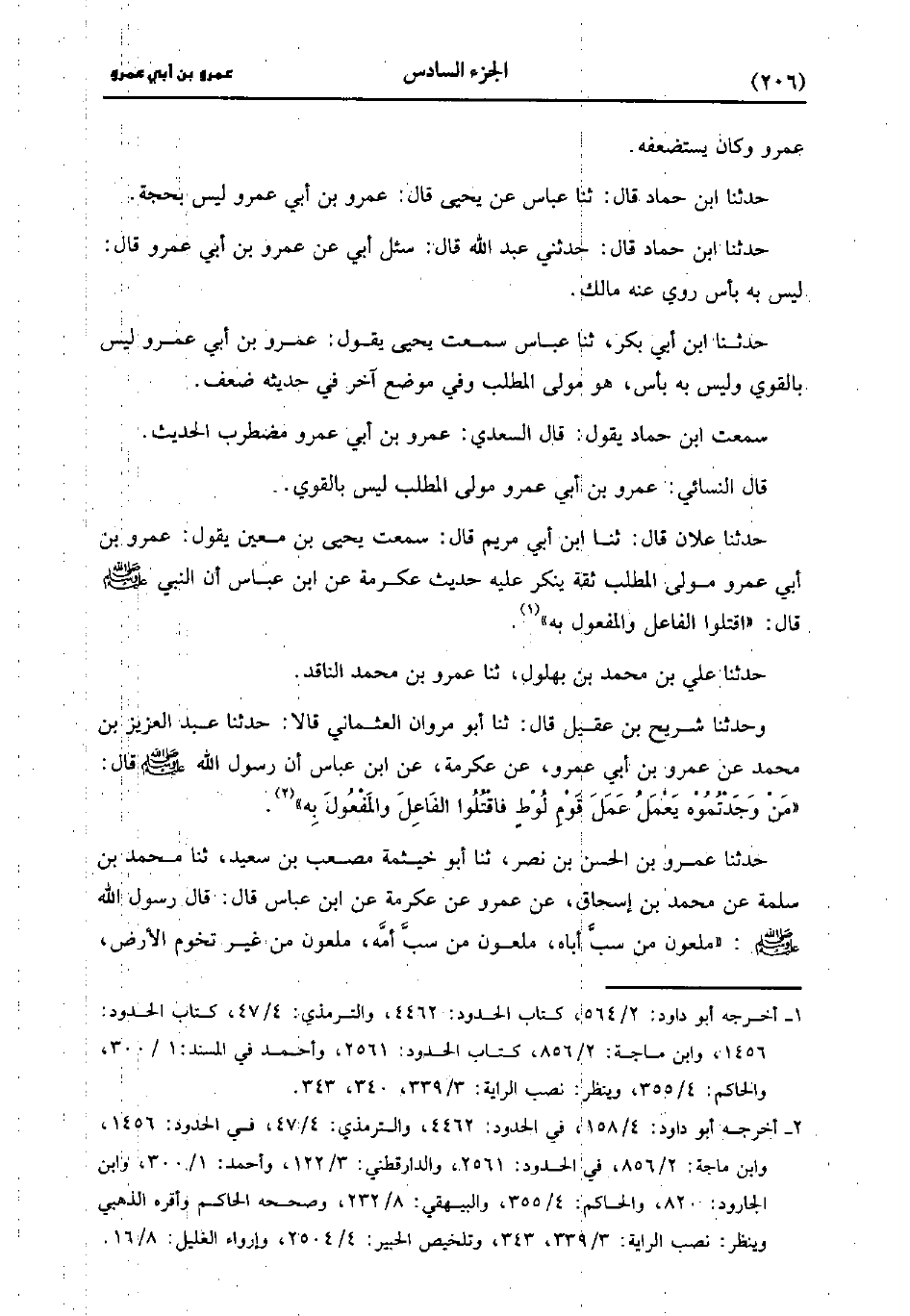 حَدَّثَنَا عَلانُ، قَال: حَدَّثَنا ابن أبي مريم، قَالَ: سَمِعْتُ يَحْيى بْنَ مَعِين يَقُولُ عَمْرو بْن أبي عَمْرو مَوْلَى الْمُطَّلِبِ ثِقَةٌ يُنْكَرُ عَلَيْهِ حديث عِكرمَة، عنِ ابْن عباس أَنّ النَّبِيَّ صَلَّى اللَّهُ عَلَيه وسَلَّم قَال: اقْتُلُوا الْفَاعِلَ وَالْمَفْعُولَ بِهِ.