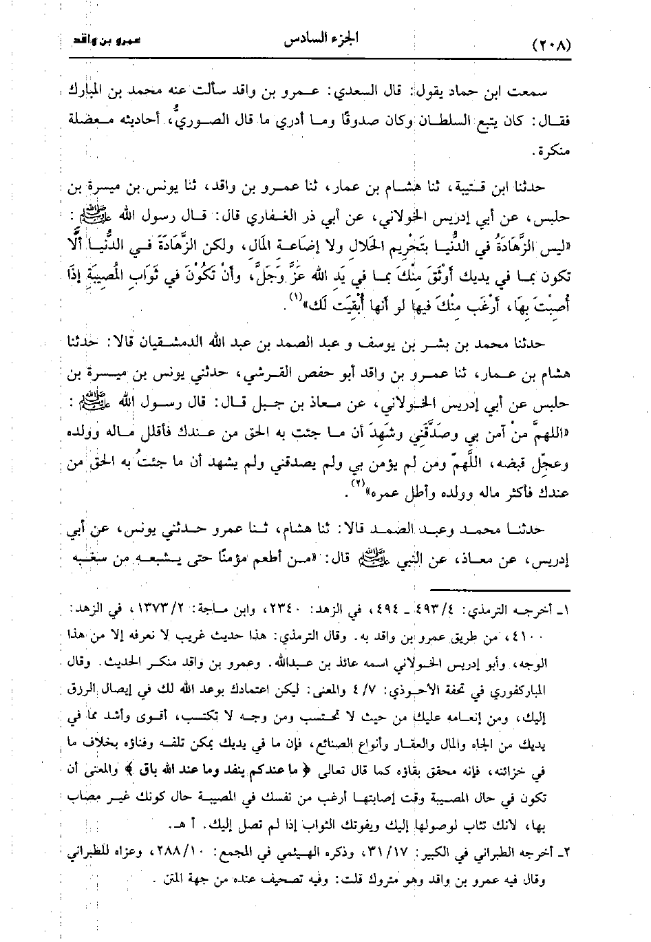 حَدَّثَنَا ابن قُتَيْبَةَ، حَدَّثَنا هِشَامُ بْنُ عَمَّارٍ، حَدَّثَنا عَمْرو بن واقد، حَدَّثَنا يُونُس بْنُ مَيْسَرَةَ بْنِ حَلْبَسٍ، عَن أَبِي إِدْرِيسَ الْخَوْلانِيِّ، عَن أَبِي ذَرٍّ الْغِفَارِيِّ، قَال: قَال رَسُولِ اللَّهِ صَلَّى اللَّهُ عَلَيْهِ وَسَلَّمَ لَيْسَ الزَّهَادَةُ فِي الدُّنْيَا بِتَحْرِيمِ الْحَلالِ، ولاَ إِضَاعَةِ الْمَالِ وَلَكِنَّ الزَّهَادَةَ فِي الدُّنْيَا أَلا تَكُونَ بِمَا فِي يَدَيْكَ أَوْثَقَ مِنْكَ بِمَا فِي يَدِ اللَّهِ عَزَّ وَجَلَّ وَأَنْ تَكُونَ فِي ثَوَابِ الْمُصِيبَةِ إِذَا أُصِبْتَ بِهَا أَرْغَبَ مِنْكَ فِيهَا لَوْ أَنَّهَا أُبْقِيَتْ لَكَ.