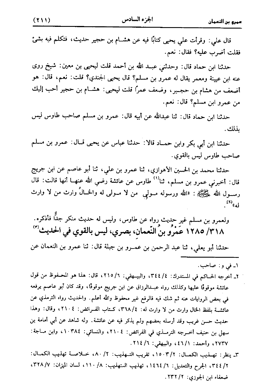 حَدَّثَنَا مُحَمد بْنُ الحسين الأهوازي، حَدَّثَنا عَمْرو بن علي، حَدَّثَنا أَبُو عَاصِمٍ، عنِ ابْنِ جُرَيج قَالَ أَخْبَرَنِي عَمْرو بْنُ مُسْلِمٍ، حَدَّثَنا طاووس عن عائشة رضي الله عَنْهَا أَنَّهَا قَالَتْ قَال رَسُول اللهِ صَلَّى اللَّهُ عَلَيهِ وَسلَّمَ اللَّهُ وَرَسُولُهُ مَوْلَى مَنْ لا مَوْلَى لَهُ وَالْخَالُ وَارِثُ مَنْ لا وَارِثَ لَهُ.