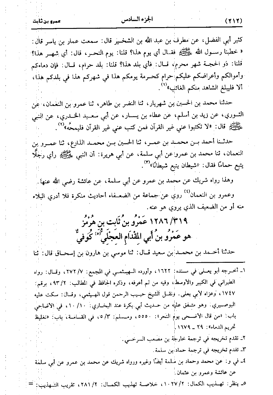 كَثِيرٍ أَبِي الْفَضْلِ عَنْ مُطَرِّفِ بْنِ عَبد اللَّهِ بْنِ الشِّخِّيرِ، قَالَ: سَمِعْتُ عَمَّارَ بْنَ يَاسِرٍ قَالَ خَطَبَنَا رَسُولُ اللَّهِ صَلَّى اللَّهُ عَلَيْهِ وَسَلَّمَ فَقَالَ أَيُّ يَوْمٍ هَذَا قُلْنَا يَوْمُ النَّحْرِ قَالَ أَيُّ شَهْرٍ هَذَا قُلْنَا ذُو الْحِجَّةِ شَهْرٌ مُحَرَّمٌ قَالَ فَأَيُّ بَلَدٍ هَذَا قُلْنَا بَلَدٌ حَرَامٌ قَالَ فَإِنَّ دِمَاءَكُمْ وَأَمْوَالَكُمْ وَأَعْرَاضَكُمْ عَلَيْكُمْ حَرَامٌ كَحُرْمَةِ يَوْمِكُمْ هَذَا فِي شَهْرِكُمْ هَذَا فِي بَلَدِكُمْ هَذَا أَلا فَلْيُبَلِّغِ الشَّاهِدُ مِنْكُمُ الْغَائِبَ.