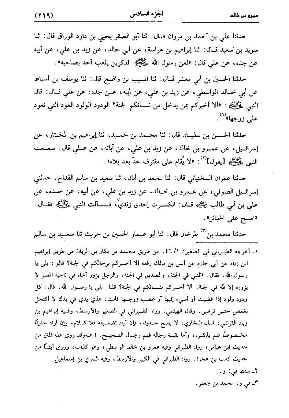 ، حَدَّثَنا عَلِيُّ بْنُ أَحْمَدَ بْنِ مروان، قَال: حَدَّثَنا أَبُو الصَّقْرِ يَحْيى بْنُ دَاوُدَ الوراق، قَال: حَدَّثَنا سويد بن سَعِيد، قَال: حَدَّثَنا إِبْرَاهِيمُ بْنُ هِرَاسَةَ، عَن أَبِي خَالِدٍ عَنْ زَيْدِ بْنِ عَلِيٍّ، عَنْ أَبِيهِ، عَن جَدِّهِ عَنْ عَلِيٍّ قَالَ لَعَنَ رَسُولُ اللَّهِ صَلَّى اللَّهُ عَلَيْهِ وَسَلَّمَ الذَّكَرَيْنِ يَلْعَبُ أَحَدٌ بِصَاحِبِهِ.