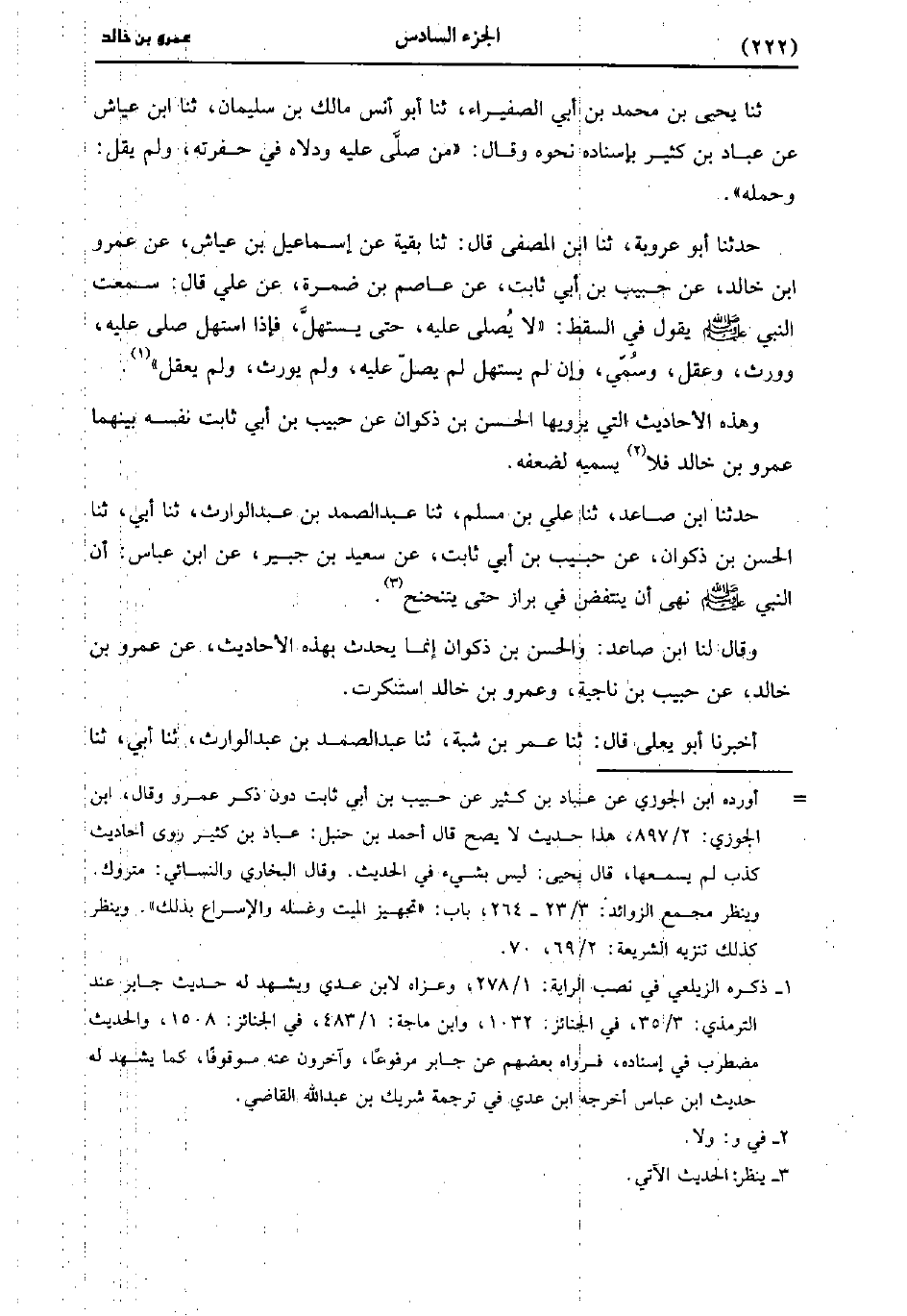 حَدَّثَنَا أَبُو عَرُوبة، حَدَّثَنا ابْنُ المصفى، قَال: حَدَّثَنا بَقِيَّةُ عَنْ إِسْمَاعِيلَ بْنِ عَيَّاشٍ عَنْ عَمْرو بْنِ خَالِدٍ عَنْ حَبِيبِ بْنِ أَبِي ثَابِتٍ، عَن عَاصِمِ بْنِ ضَمْرَةَ عَنْ عَلِيٍّ، قَالَ: سَمِعْتُ النَّبِيَّ صَلَّى اللَّهُ عَلَيهِ وَسلَّمَ يَقُولُ فِي السِّقْطِ لا يُصَلَّى عَلَيْهِ حَتَّى يَسْتَهِلَّ فَإِذَا اسْتَهَلَّ صُلِّيَ عَلَيْهِ وَوُرِّثَ وَعُقِلَ وَسُمِّيَ وَإِنْ لَمْ يَسْتَهِلَّ لَمْ يُصَلَّ عَلَيْهِ وَلَمْ يُوَرَّثْ وَلَمْ يُعْقَلْ.