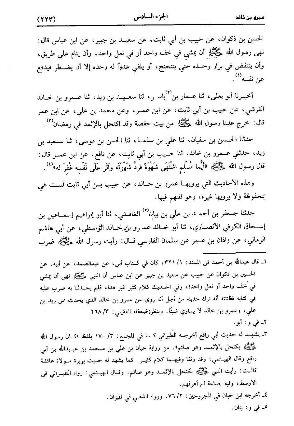 حَدَّثَنَا أبو يعلى، حَدَّثَنا عمار بن ياسر، حَدَّثَنا سَعِيد بن زيد، حَدَّثَنا عَمْرو بْنُ خَالِدٍ الْقُرَشِيُّ عَنْ حَبِيبِ بْنِ أَبِي ثَابِتٍ، عنِ ابْنِ عُمَر وَعَنْ مُحَمد بْنِ عَلِيٍّ، عنِ ابْنِ عُمَر قَالَ خَرَجَ عَلَيْنَا رَسُولُ اللَّهِ صَلَّى اللَّهُ عَلَيْهِ وَسَلَّمَ مِنْ بَيْتِ حَفْصَةَ وَقَدِ اكْتَحَلَ بِالإِثْمِدِ فِي رَمَضَانَ.