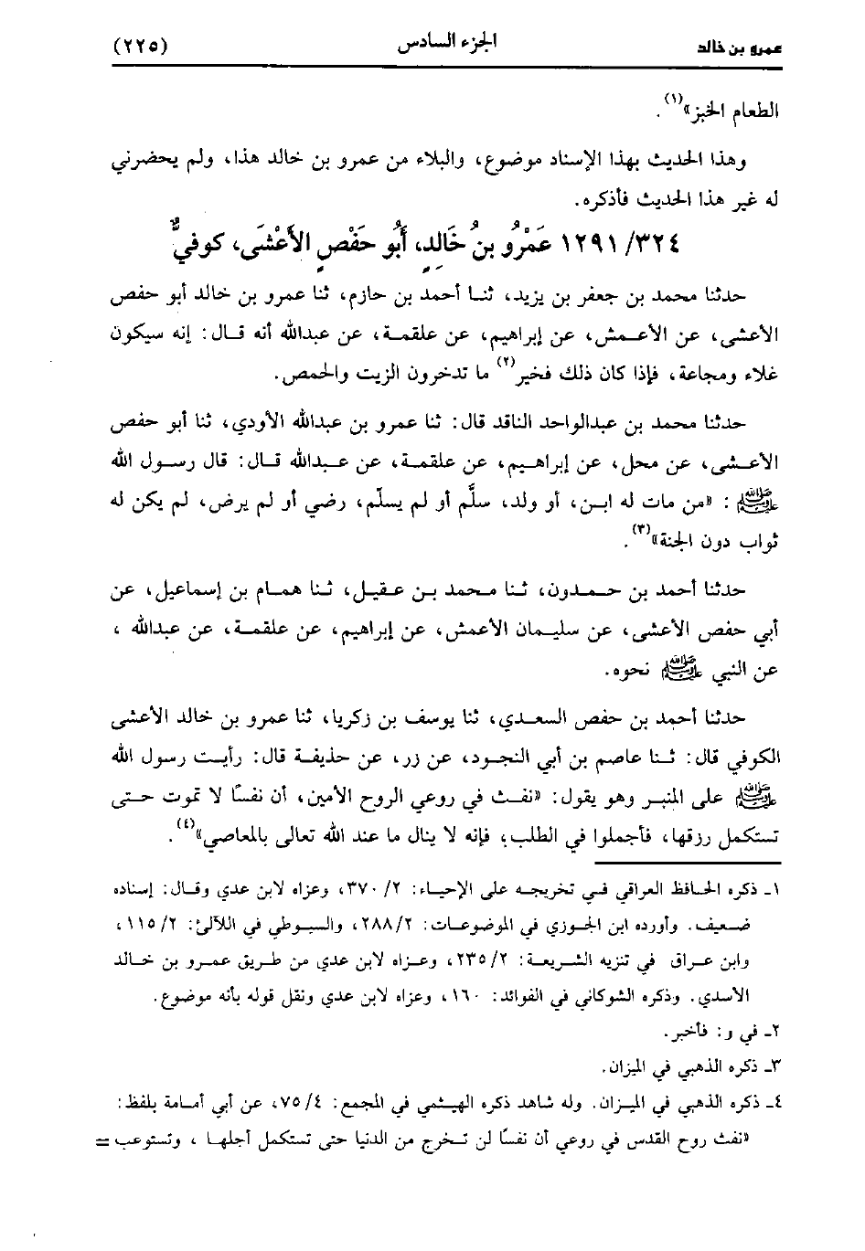 حَدَّثَنَا أَحْمَدُ بْنُ حَمْدُونَ، حَدَّثَنا مُحَمد بن عقيل، حَدَّثَنا هَمَّامُ بْنُ إِسْمَاعِيلَ، عَن أَبِي حَفْصٍ الأَعْشَى عَنْ سُلَيْمَانَ الأَعْمَش عَنْ إِبْرَاهِيمَ عَنْ عَلْقَمَةَ عَنْ عَبد اللَّهِ عَنِ النَّبِيِّ صَلَّى اللَّهُ عَلَيهِ وَسلَّمَ نَحْوَهُ، حَدَّثَنا أَحْمَدُ بْنُ حَفْصٍ السَّعْدِيُّ، حَدَّثَنا يوسف بن زكريا، حَدَّثَنا عَمْرو بْنُ خَالِدٍ الأَعْشَى الْكُوفِيُّ، قَال: حَدَّثَنا عَاصِمِ بْنِ أَبِي النَّجُودِ عَنْ زِرٍّ عَنْ حُذَيْفَةَ، قَالَ: رأيتُ رَسُولِ اللَّهِ صَلَّى اللَّهُ عَلَيْهِ وَسَلَّمَ عَلَى الْمِنْبَرِ، وَهو يَقُولُ نَفَثَ فِي رُوعِي الرُّوحُ الأَمِينُ أَنَّ نَفْسًا لا تَمُوتُ حَتَّى تَسْتَكْمِلَ رِزْقَهَا فَأَجْمِلُوا فِي الطَّلَبِ فَإِنَّهُ لا يُنَالُ مَا عِنْدَ الله تعالى بالمعاصي